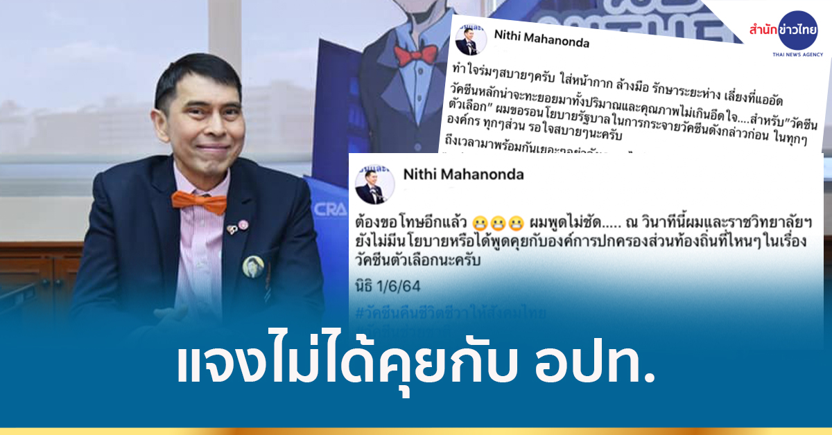 สำนักข่าวไทย 1มิ.ย.- หมอนิธิ โพสต์เพซบุ๊ก แจงไม่มีนโยบายคุยเรื่องวัคซีนซิโนฟาร์มกับ อปท.