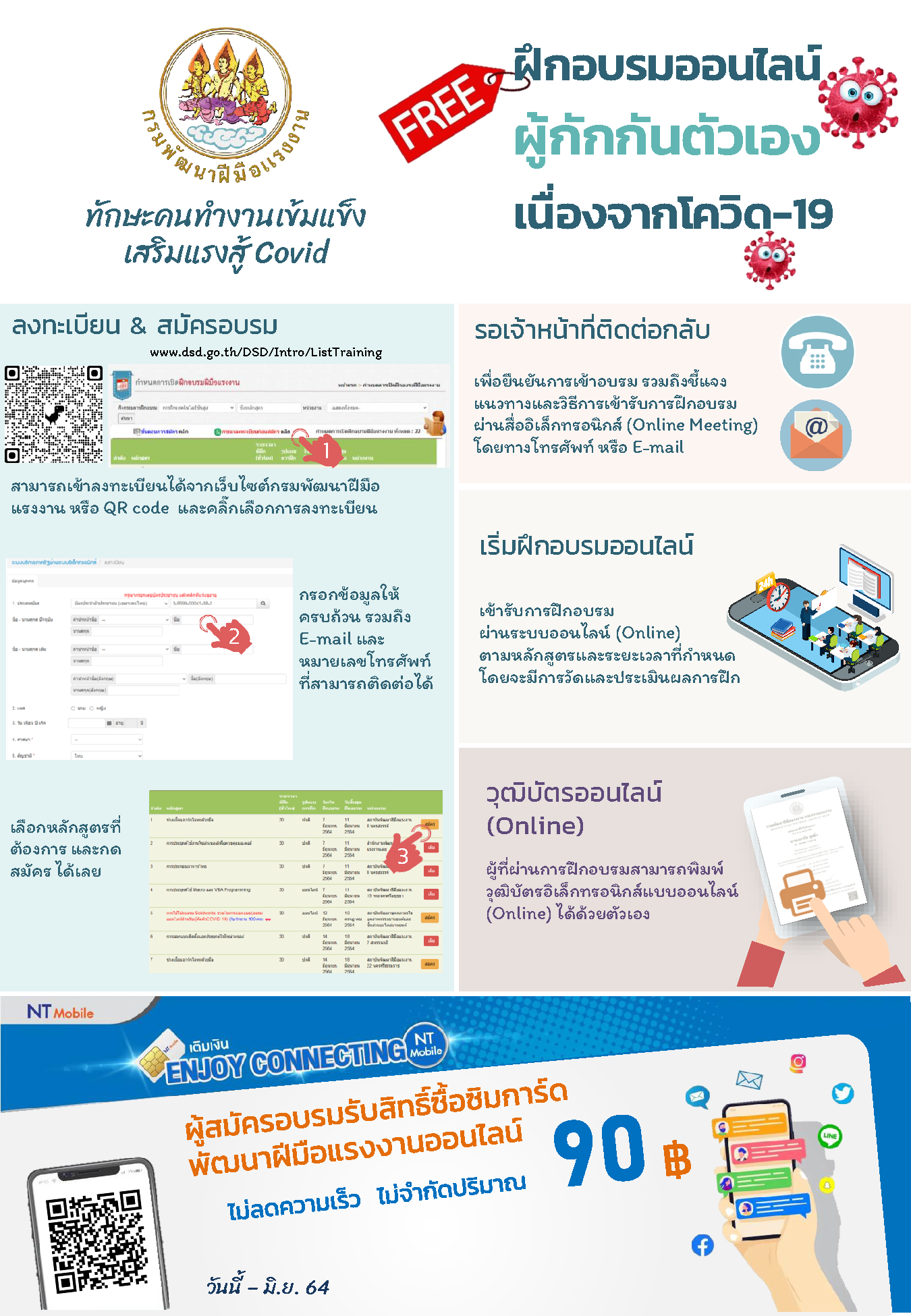 สำหรับผู้สนใจสามารถค้นหาหลักสูตรและลงทะเบียนได้ที่เว็บไซต์กรมพัฒนาฝีมือแรงงาน www.dsd.go.th เลือก “อบรมออนไลน์ผู้กักตัว COVID-19” และดำเนินการตามขั้นตอนดังนี้