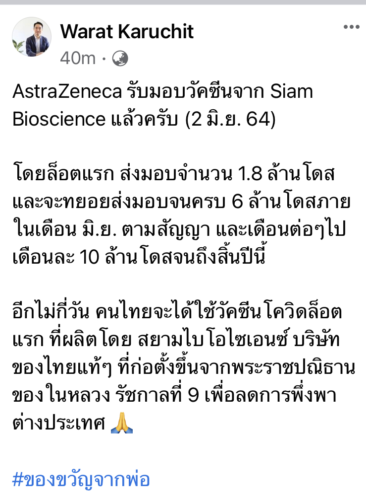“AstraZeneca รับมอบวัคซีนจาก Siam Bioscience แล้วครับ (2 มิ.ย. 64) โดยล็อตแรก ส่งมอบจำนวน 1.8 ล้านโดส และจะทยอยส่งมอบจนครบ 6 ล้านโดสภายในเดือน มิ.ย. ตามสัญญา และเดือนต่อๆไปเดือนละ 10 ล้านโดสจนถึงสิ้นปีนี้