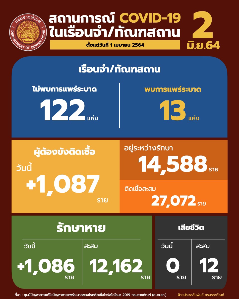 กรมราชทัณฑ์ 2มิ.ย.-สถานการณ์โควิดในเรือนจำและทัณฑสถาน ณ วันที่ 1 มิ.ย. ( 18.00 น.) มีผู้ต้องขังติดเชื้อใหม่ 1,087 ราย รักษาหาย 1,086 ราย ทำให้มีผู้ต้องขังที่ยังติดเชื้ออยู่ในการดูแล 14,588 ราย พรุ่งนี้เริ่มฉีดวัคซีน