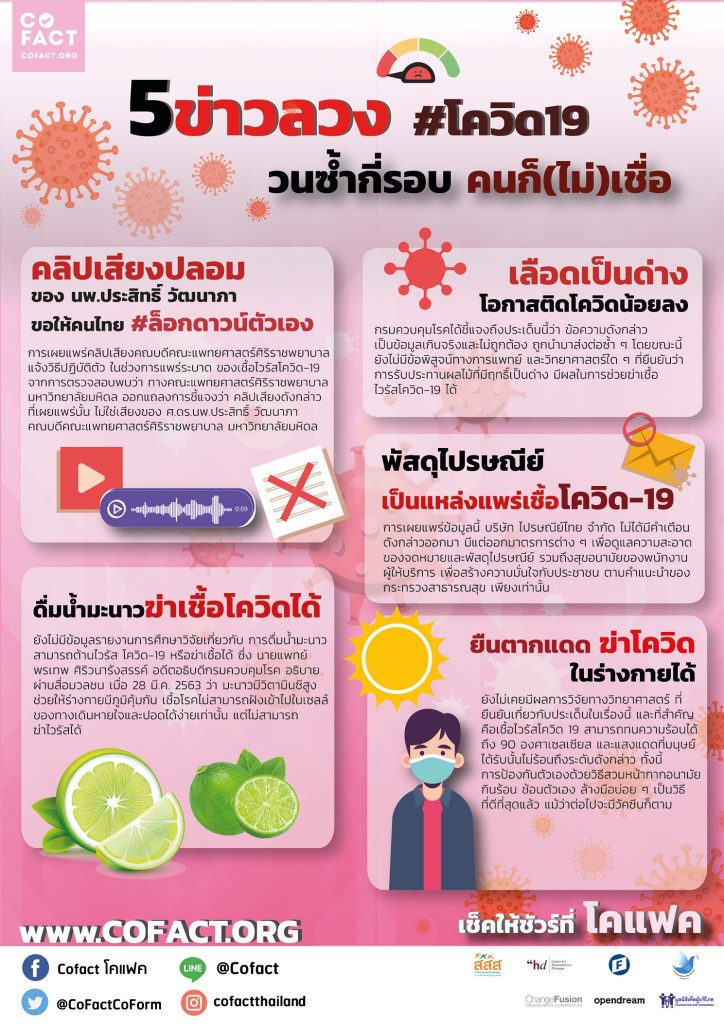 นายชิตพงษ์ กิตตินราดร ผู้แทนทีมวิจัยนวัตกรรมโคแฟค กล่าวว่า ผลการสำรวจพบข่าวลวง 2 เรื่องใหม่ที่น่าห่วง คือ 1.ข่าวฟ้าทะลายโจรป้องกันการติดโควิด-19 ได้ มาจากคลิปบิดเบือนบนยูทูบ ข่าวลวงนี้กระจายบนเฟซบุ๊ก ทวิตเตอร์ อินสตราแกรม โดยผู้เผยแพร่มีวัตถุประสงค์เพื่อต้องการขายสินค้า เมื่อโคแฟคตรวจสอบข้อมูลจากกรมการแพทย์แผนไทยและการแพทย์ทางเลือก พบว่าฟ้าทะลายโจรเป็นอีกทางเลือกที่ได้รับการยอมรับและนำไปรักษาควบคู่กับแพทย์แผนปัจจุบัน โดยที่ผ่านมา ได้ศึกษาวิจัยฟ้าทลายโจรที่มีสารแอนโดรกราโฟไลด์ (Andrographolide) ในผู้ป่วยอาการไม่หนัก จำนวน 309 ราย พบว่า สามารถยับยั้งความรุนแรงของโควิด-19 ได้ แต่ยังไม่สามารถป้องกันโควิด-19 ได้ และ 2.ข่าวแอปพลิเคชันเป๋าตังค์ สามารถใช้เพื่อกู้เงินหรือยืมเงินสดได้ ข่าวลวงนี้ระบาดมาจากกลุ่มไลน์สนทนาแบบปิด โคแฟคได้ทำการตรวจสอบข้อมูลจากกระทรวงการคลัง พบว่า ไม่มีนโยบายให้สินเชื่อแต่อย่างใด