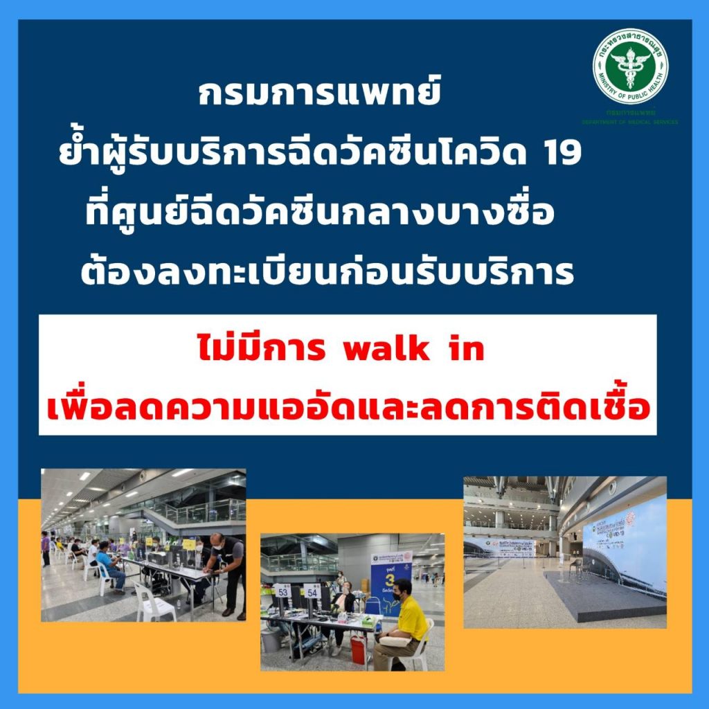 กรุงเทพฯ 3 มิ.ย.-กรมการแพทย์ ย้ำผู้รับบริการฉีดวัคซีนโควิด-19 ที่ศูนย์ฉีดวัคซีนกลางบางซื่อ ต้องลงทะเบียนก่อน ไม่มีการ walk in เพื่อลดความแออัดและลดการติดเชื้อ