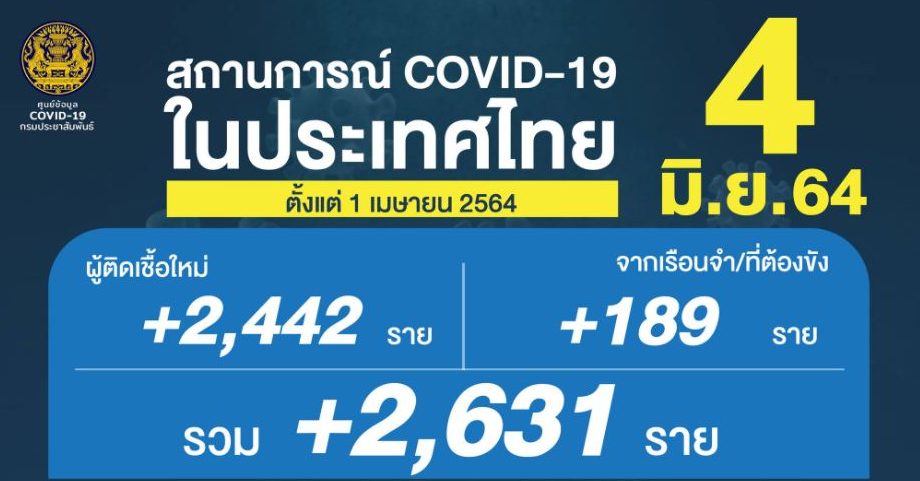 กรุงเทพฯ 4 มิ.ย.- ยอดติดเชื้อโควิด-19 วันนี้ พบผู้ติดเชื้อรายใหม่เพิ่ม 2,631 คน มีผู้เสียชีวิต 31 ราย ด้านโฮมโปร ประกาศปิดการให้บริการเป็นเวลา 3 วัน ตั้งแต่วันนี้ (4 มิ.ย.) ถึงวันอาทิตย์ที่ 6 มิ.ย.