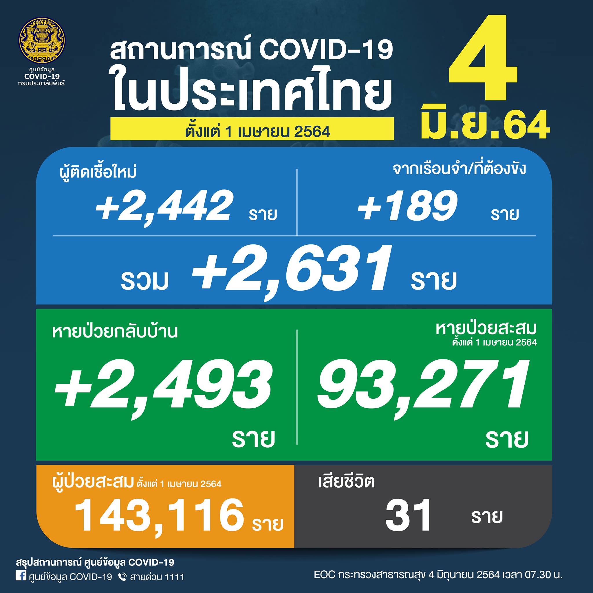 สถานการณ์การแพร่ระบาดของโรคติดเชื้อไวรัสโคโรนา 2019 หรือโควิด-19 ในไทยวันนี้ พบผู้ติดเชื้อรายใหม่เพิ่ม 2,631 คน แบ่งเป็นผู้ติดเชื้อใหม่ 2,442 คน และผู้ติดเชื้อในเรือนจำ 189 คน หายป่วยกลับบ้าน 2,493 คนหายป่วยสะสม 93,271 คน รวมยอดติดเชื้อสะสมตั้งแต่ 1 เมษายน จำนวน 143,116 คน และมีผู้เสียชีวิต 31 ราย