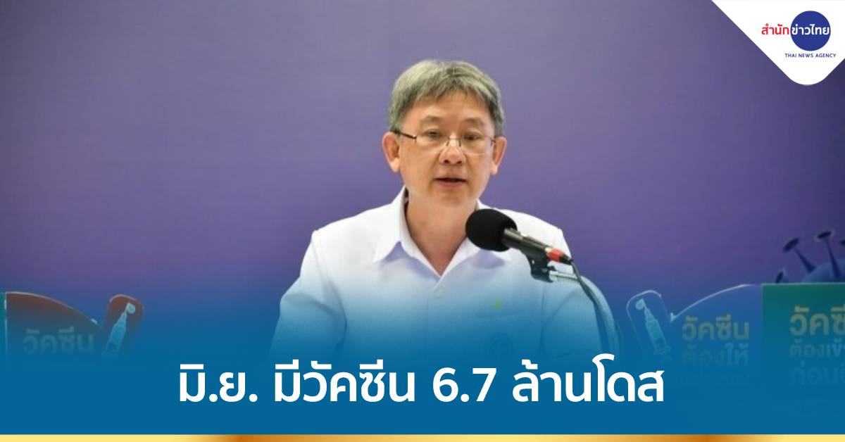 สำนักข่าวไทย 4 มิ.ย.-อธิบดี คร.แจงยิบยอดวัคซีนโควิดฉีดเดือน มิ.ย. แอสตราฯ มาแล้ว 2 ล้านโดส ซิโนแวคเข้า 1.5 ล้านโดส รวม 2 สัปดาห์แรก มีวัคซีนในมือ 3.54 ล้านโดส จากนั้นสัปดาห์ที่ 3-4 วัคซีนทยอยเข้ามาอีกรวม 3.2 ล้าน ยอด มิ.ย.รวม 6.7 ล้านโดส หากฉีดทั้งเดือนตามเป้า ครอบคลุม 10 ล้านโดส