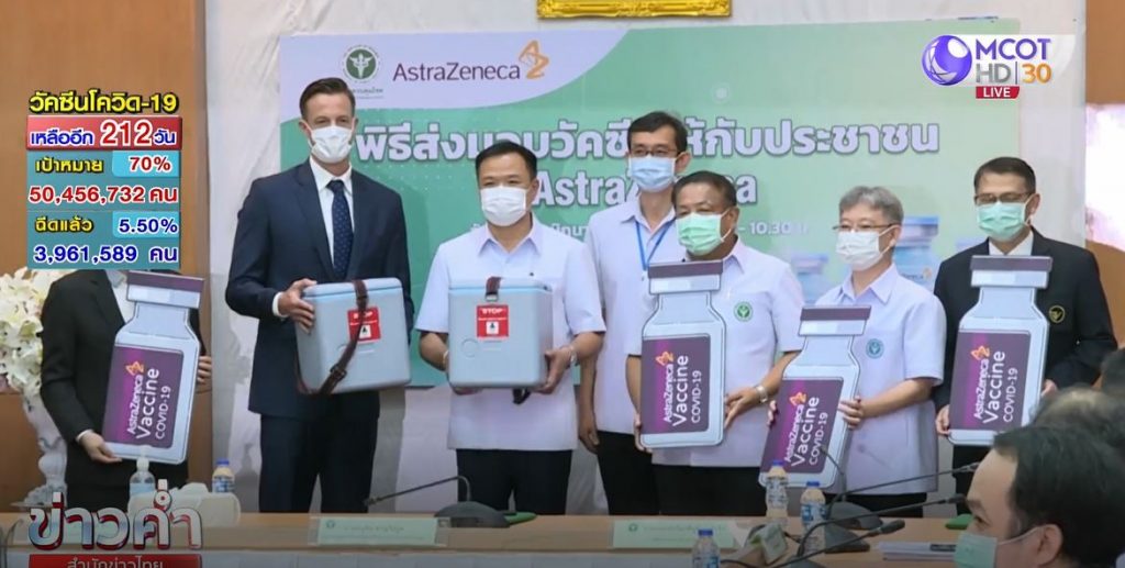 นายอนุทิน ชาญวีรกูล รองนายกรัฐมนตรีและรัฐมนตรีว่าการกระทรวงสาธารณสุข พร้อมด้วยนายแพทย์เกียรติภูมิ วงศ์รจิต ปลัดกระทรวงสาธารณสุข และนายเจมส์ ทีก ประธานบริษัทแอสตราเซนเนกา ร่วมกันแถลงข่าว ในพิธีรับมอบวัคซีนแอสตราเซนเนกา ที่ผลิตในไทย โดยบริษัทสยามไบโอไซเอนซ์ โดยการส่งมอบในลอตแรกนี้มีจำนวน 1.8 ล้านโดส และบริษัทจะทยอยส่งมอบให้อีกจนครบสัญญาสั่งซื้อ ส่วนการฉีดวัคซีนยืนยันว่าคิกออฟวันที่ 7 มิถุนายน ไม่เปลี่ยนแปลง ขณะที่การจัดสรรควัคซีนแต่ละพื้นที่ ยืนยันว่ามีความเท่าเทียมและเป็นธรรม โดยคำนึงสัดส่วนประชากรในพื้นที่ การระบาด พื้นที่เศรษฐกิจ พื้นที่จำเพาะ เช่น บุคลากรครู ตามนโยบาย ศบค.