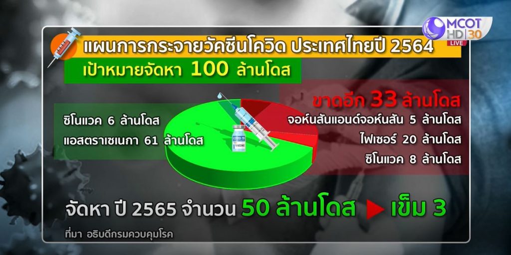 ส่วนการจัดหาวัคซีนของรัฐ ปีนี้ตั้งเป้าจัดสรรวัคซีนให้ได้ 100 ล้านโดส ส่วนปีหน้าเตรียมจัดหาวัคซีนเพิ่มอีก 50 ล้านโดส ซึ่งอาจเป็นการฉีดวัคซีนในเข็มที่ 3 ให้ครอบคลุมการระบาดทุกสายพันธุ์ แต่ก่อนไปปีหน้า อธิบดีกรมควบคุมโรคแจกแจงว่าตอนนี้ 100 ล้านโดส ไทยมีซิโนแวคแล้ว 6 ล้านโดส ลงนามในสัญญาสั่งซื้อแอสตราเซนเนกา 61 ล้านโดส เท่ากับปัจจุบันไทยยังขาดวัคซีนอยู่อีก 33 ล้านโดส แต่หากมองไปถึงจอห์นสัน แอนด์ จอห์นสัน และไฟเซอร์ ที่กำลังติดต่อกันอยู่ และคาดว่าได้เพิ่มมาอีก 25 ล้านโดส บวกกับจัดหาซิโนแวคเพิ่มอีก 8 ล้านโดส รวมแล้วปีนี้ได้มาตามเป้า 100 ล้านโดสแน่นอน