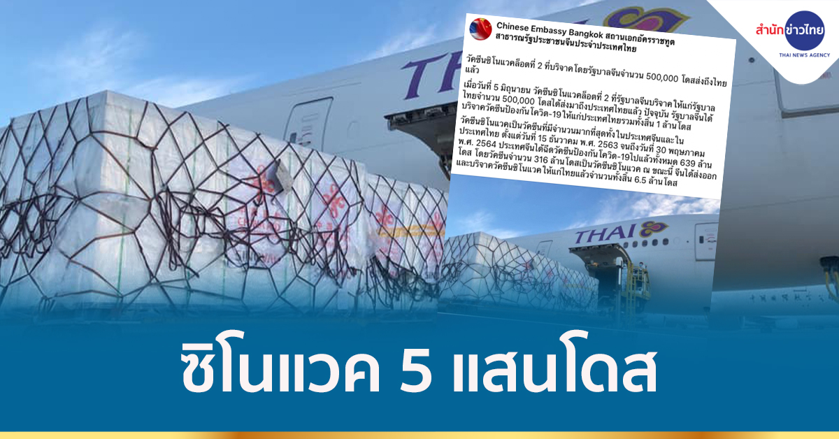 กรุงเทพฯ 5 มิ.ย.-สถานเอกอัครราชทูตสาธารณรัฐประชาชนจีนประจำประเทศไทย โพสต์แจ้งวัคซีนซิโนแวค ลอต 2 ที่บริจาคโดยรัฐบาลจีนจำนวน 500,000 โดสส่งถึงไทยแล้ว