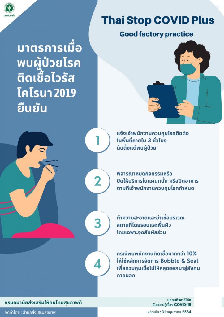 และ 4) มาตรการเมื่อพบผู้ติดเชื้อ ให้แจ้งเจ้าพนักงานควบคุมโรคติดต่อในพื้นที่ภายใน 3 ชั่วโมง เพื่อให้เจ้าหน้าที่สั่งการและคำแนะนำ หลังจากนั้นให้พิจารณาปิดพื้นที่หรือสถานที่และทำความสะอาดพื้นผิวทันที ส่วนผู้สัมผัสเสี่ยงสูงให้ส่งตรวจเชื้อและกักตนเองทันที ส่วนผู้เสี่ยงต่ำให้มีการเฝ้าระวังอย่างใกล้ชิด ถ้ามีผู้ติดเชื้อมากกว่าร้อยละ 10 ให้ใช้ Bubble and seal เพื่อป้องกันการแพร่ระบาดของโรค และให้กระบวนการผลิตสามารถดำเนินการต่อไปได้” อธิบดีกรมอนามัย กล่าวในที่สุด.-สำนักข่าวไทย
