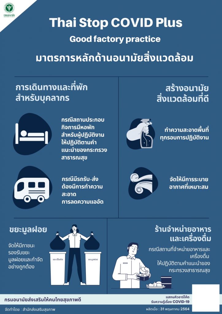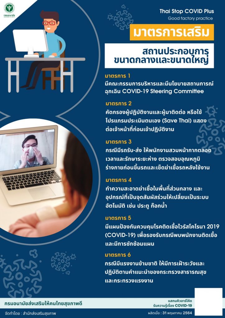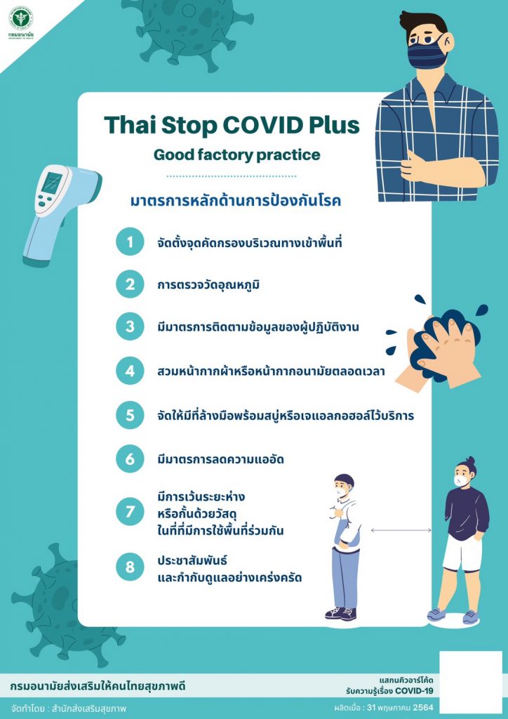 นายแพทย์สุวรรณชัย วัฒนายิ่งเจริญชัย อธิบดีกรมอนามัย เปิดเผยว่า จากสถานการณ์การแพร่ระบาดของโรคโควิด-19 ในกลุ่มโรงงานอุตสาหกรรม กรมอนามัยได้ร่วมกับกระทรวงแรงงาน สภาอุตสาหกรรม และกระทรวงมหาดไทย ดูแลในเรื่องการป้องกันความเสี่ยงร่วม โดยสื่อสารให้สถานประกอบกิจการประเภทโรงงานปฏิบัติตามแนวทางทางการป้องกันโรค Good Factory practice (GFP) ด้วยการประเมินตนเองผ่านแพลตฟอร์ม Thai Stop COVID Plus ซึ่งมีมาตรการหลัก 14 ข้อ แบ่งเป็นด้านการป้องกันโรค 8 ข้อ ด้านอนามัยสิ่งแวดล้อม 6 ข้อ และเมื่อประเมินแล้วจะส่งข้อมูลกลับมาบนฐานข้อมูลออนไลน์ หากโรงงานไหนประเมินไม่ผ่านจะต้องมีการปรับปรุง นอกจากนี้จะมีการประเมินแบบ On site โดยหน่วยงานที่เกี่ยวข้องระดับจังหวัดจะเข้าไปสุ่มประเมิน โดยกำหนดให้ทุกจังหวัดต้องมีการประเมินโรงงานไม่น้อยกว่าร้อยละ 10-20 ซึ่งสถานประกอบกิจการประเภทโรงงานที่มีคนงานคนไทยและแรงงานต่างด้าวเป็นจำนวนมาก จะมีความเสี่ยงมากเป็นอันดับต้นๆ ขอให้สถานประกอบกิจการประเภทโรงงานขนาดใหญ่ประเมินตนเองให้เสร็จภายในวันที่ 15 มิถุนายนนี้ แต่หากมีมาตรการ ที่ไม่ผ่าน ต้องดำเนินการปรับปรุงแก้ไขให้แล้วเสร็จภายในวันที่ 30 มิถุนายน เพื่อที่สำนักงานอุตสาหกรรมจังหวัด สำนักงานแรงงานจังหวัด และสำนักงานสาธารณสุขจังหวัด จะดำเนินการสุ่มตรวจโดยกรมอนามัยได้ทำหนังสือส่งถึงผู้ประกอบการให้ เข้าไปประเมินตนเอง และขอให้ประเมินตามความเป็นจริง เพื่อเป็นประโยชน์ในการป้องกันโรคและแก้ไขจุดเสี่ยงต่อไป