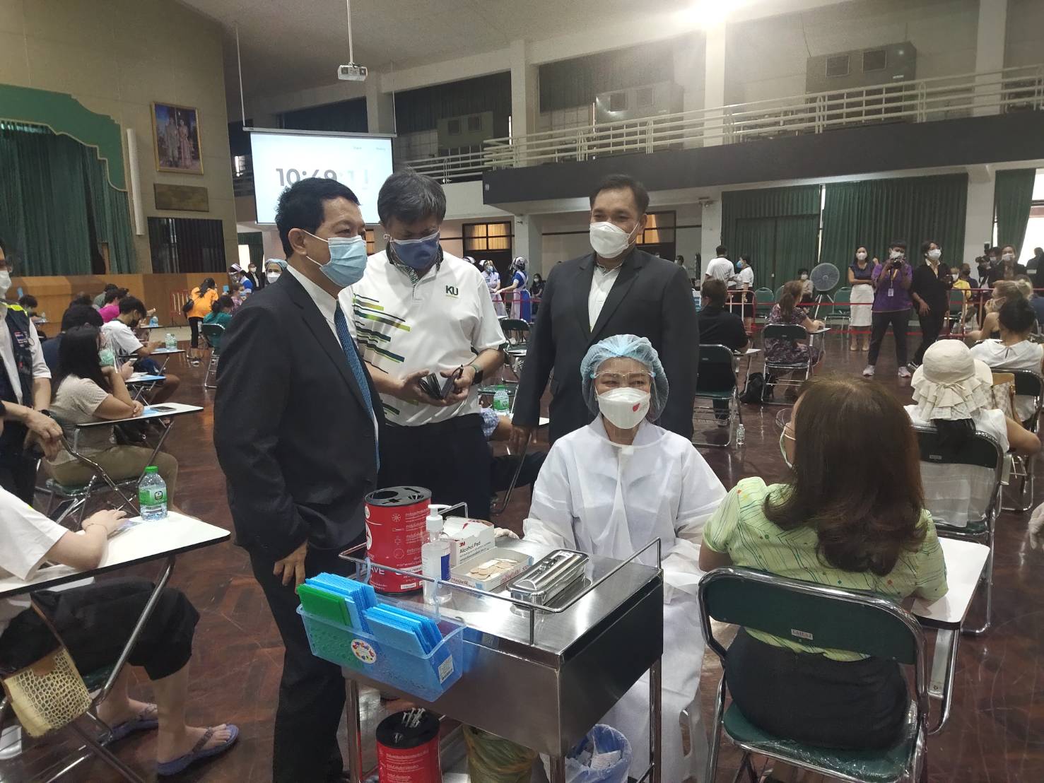 ด้าน ดร.จงรัก วัชรินทร์รัตน์ อธิการบดีมหาวิทยาลัยเกษตรศาสตร์ กล่าวว่า เป้าหมายของศูนย์บริการฉีดวัคซีนของ มก. ในเดือน มิ.ย.นี้ มีจำนวนประมาณ 45,000 โดส ฉีดวันละประมาณ 1,500-5,000 คน ตามการนัดหมาย มีทีมแพทย์ พยาบาล เจ้าหน้าที่ จิตอาสาจากราชวิทยาลัยจุฬาภรณ์ วิทยาลัยแพทยศาสตร์พระมงกุฎเกล้า และวิทยาลัยพยาบาลบรมราชชนนี นพรัตน์วชิระ มาช่วยฉีดวัคซีน ดังนั้น ขอให้มั่นใจ โดยภายใน มก. จะมีศูนย์บริการฉีดวัคซีนทั้งหมด 2 ศูนย์ ได้แก่ ศูนย์บริการฉีดวัคซีน KU สู้ COVID-19 ภายใต้ อว. ที่อาคารจักรพันธ์เพ็ญศิริ กำหนดฉีดเวลา 08.00-16.00 น. วันที่ 7, 8, 11, 12, 18, 19, 26, 27 มิ.ย.64 และศูนย์ฉีดวัคซีนโควิด-19 สำหรับผู้ประกันตนตามมาตรา 33 โดยสำนักงานประกันสังคม ณ อาคารเสรีไตรรัตน์ (ยิมเนเซียมด้านถนนวิภาวดีรังสิต) กำหนดฉีดเวลา 08.00-15.00 น. วันที่ 7-21 มิ.ย.64