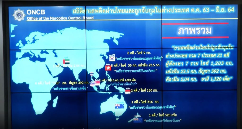 นายสมศักดิ์ เทพสุทิน รัฐมนตรีว่าการกระทรวงยุติธรรม แถลงปมไทยเป็นศูนย์กลางส่งออกยาเสพติด และมีปริมาณมากขึ้นทุกๆปี เนื่องจากไทยติดกับสามเหลี่ยมทองคำแหล่งผลิตยาสำคัญ และการคมนาคมสะดวกทั้งทางบก ทางเรือ ทางอากาศ ซึ่งเอื้อประโยชน์ให้กลุ่มขบวนการค้ายาเสพติดใช้ประเทศไทยเป็นศูนย์กลางในการเจรจา ซุกซ่อน อำพราง และจัดส่งยาไปยังประเทศปลายทาง