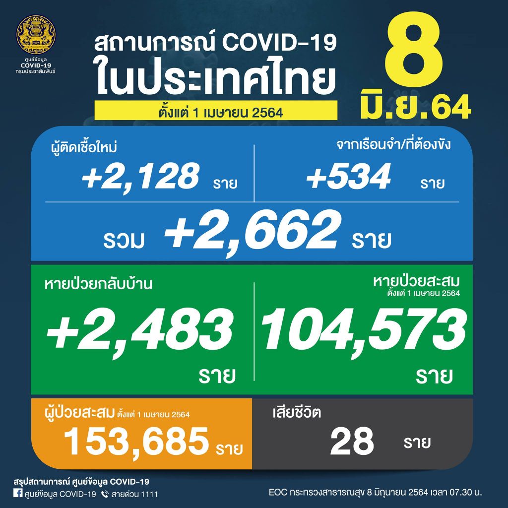 กรุงเทพฯ 8 มิ.ย.-โควิดวันนี้ ติดเชื้ออีก 2,662 ราย ยืนยันสะสม 153,685 ราย (ตั้งแต่ 1 เมษายน) หายป่วยกลับบ้าน 2,483 ราย เสียชีวิตอีก 28 ราย