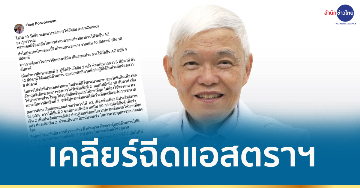 กทม.9 มิ.ย.-“นพ.ยง” เคลียร์ข้อสงสัยการกำหนดระยะห่างในการให้วัคซีนแอสตราเซเนกาของประเทศไทย จาก 10 สัปดาห์ เป็น 16 สัปดาห์ เพื่อให้ประชากรส่วนใหญ่ของประเทศได้รับวัคซีนเข็มแรกมากที่สุด เกิดประโยชน์สูงสุดในภาวะที่ทรัพยากรจำกัด อีกทั้งผลภูมิต้านทาน ประสิทธิภาพดีกว่า