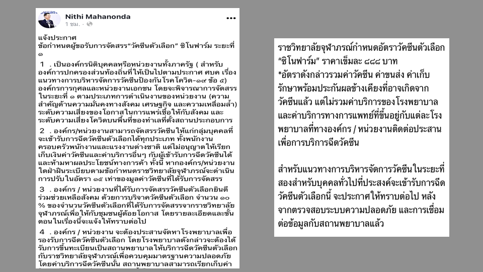 ขณะที่ ศ.นพ.นิธิ มหานนท์ เลขาธิการราชวิทยาลัยจุฬาภรณ์ โพสต์เฟซบุ๊กใจความเรื่องการกำหนดราคาวัคซีนทางเลือกซิโนฟาร์ม ว่า ราชวิทยาลัยจุฬาภรณ์กำหนดอัตราวัคซีนตัวเลือก “ซิโนฟาร์ม” ราคาเข็มละ 888 บาท ซึ่งเป็นอัตรารวมค่าวัคซีน ค่าขนส่ง ค่าเก็บรักษาพร้อมประกันผลข้างเคียงที่อาจเกิดจากวัคซีนแล้วแต่ไม่รวมค่าบริการของโรงพยาบาลและค่าบริการทางการแพทย์ที่ขึ้นอยู่กับแต่ละโรงพยาบาลที่ทางองค์กร หน่วยงานติดต่อประสานเพื่อการบริการฉีดวัคซีน ถ้าหากมีหน่วยงานใดฝ่าฝืนระเบียบของราชวิทยาลัยจุฬาภรณ์ นำวัคซีนไปหาผลประโยชน์ทางการค้า จะมีการปรับ 15 เท่าของราคาวัคซีน.-สำนักข่าวไทย
