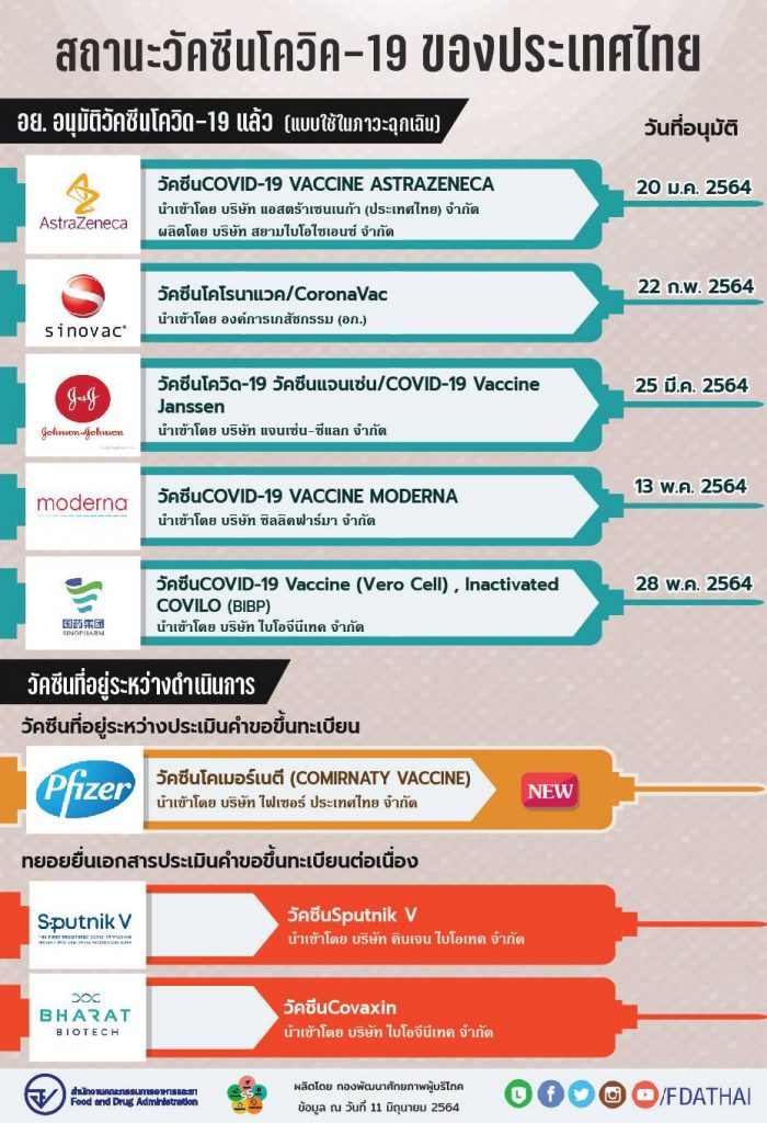 ก่อนหน้านี้ อย. ได้อนุมัติวัคซีนโควิด-19 ไปแล้ว 5 ราย ได้แก่ วัคซีนแอสตร้าเซนเนก้า โดยบริษัท แอสตร้าเซนเนก้า (ประเทศไทย) จำกัด และที่ผลิตในประเทศโดย บริษัท สยามไบโอไซเอนซ์ จำกัด วัคซีนโคโรนาแวค ของบริษัท ซิโนแวค นำเข้าโดยองค์การเภสัชกรรม วัคซีนจอห์นสันแอนด์จอห์นสัน โดยบริษัท แจนเซ่น-ซีแลค จำกัด รวมถึงวัคซีนโมเดอร์นา โดยบริษัท ซิลลิค ฟาร์มา จำกัด และล่าสุดวัคซีนของซิโนฟาร์ม โดยบริษัท ไบโอจีนีเทค จำกัด .-สำนักข่าวไทย