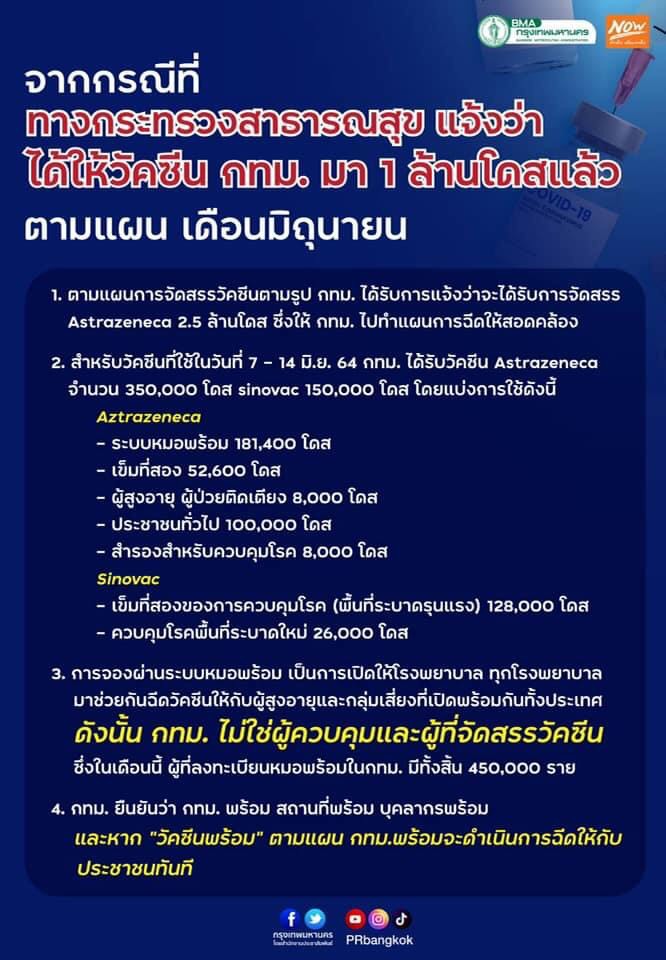 1.ตามแผนการจัดสรรวัคซีนของกระทรวงสาธารณสุข กทม. ได้รับการแจ้งว่าจะได้รับการจัดสรร AstraZeneca จำนวน 2.5 ล้านโดส ซึ่งให้กทม.ไปทำแผนการฉีดให้สอดคล้อง