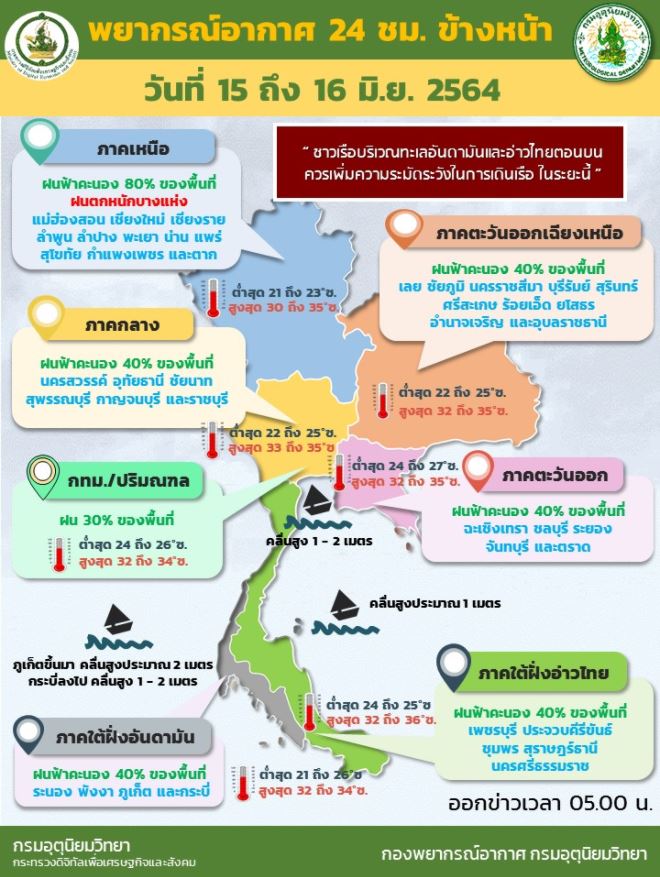กรมอุตุนิยมวิทยา พยากรณ์อากาศ 24 ชั่วโมงข้างหน้า มรสุมตะวันตกเฉียงใต้ที่พัดปกคลุมทะเลอันดามัน ประเทศไทยและอ่าวไทยเริ่มมีกำลังอ่อนลง ลักษณะเช่นนี้ทำให้บริเวณประเทศไทยยังคงมีฝนฟ้าคะนองเกิดขึ้น และมีฝนตกหนักบางแห่งในภาคเหนือ ขอให้ประชาชนบริเวณภาคเหนือระวังอันตรายจากฝนตกหนักและฝนที่ตกสะสมซึ่งอาจทำให้เกิดน้ำท่วมฉับพลันน้ำป่าไหลหลากได้ในระยะนี้