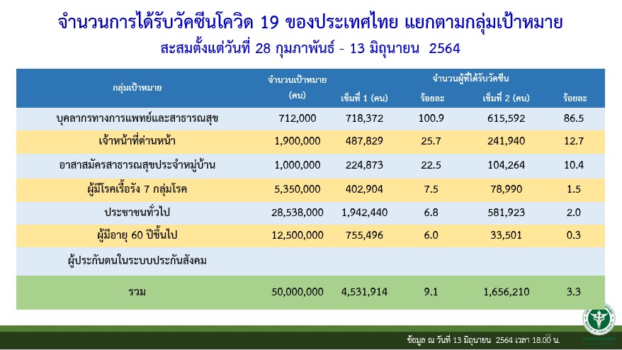 นพ.โสภณ กล่าวว่า จำนวนการได้รับวัคซีนโควิดของประเทศไทย ตั้งแต่ วันที่ 28 ก.พ.-13 มิ.ย.64 กลุ่มผู้สูงอายุ 60 ปีขึ้นไป ฉีดแล้วร้อยละ 0.3 กลุ่ม 7 โรคเรื้อรังอยู่ที่ร้อยละ 1.5 จึงต้องการเพิ่มสัดส่วนใน 2 กลุ่มนี้ ได้รับการฉีด ย้ำว่าการฉีดเฉพาะในผู้ลงทะเบียน “หมอพร้อม” ใน กทม.เท่านั้น เป็นการช่วยเหลือได้รับวัคซีนเร็วขึ้น เนื่องจากตามเป้าหมาย 2 กลุ่มนี้ต้องทยอยได้รับวัคซีน และเสร็จสิ้นในเดือนกรกฎาคม โดยทั่วประเทศมีผู้สูงอายุ และป่วย 7 โรคเรื้อรัง ลงทะเบียนผ่านหมอพร้อม 11 ล้านคน เป็นการลงทะเบียนใน กทม. 450,000 คน