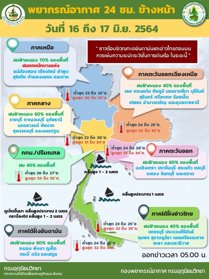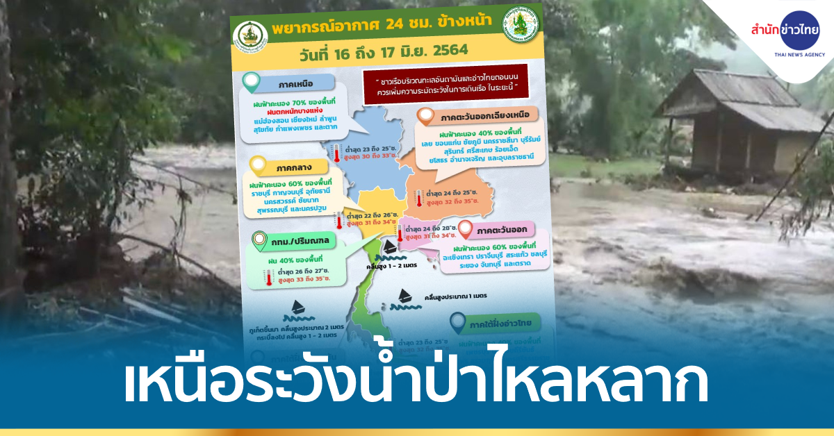 กรมอุตุนิยมวิทยา พยากรณ์อากาศ 24 ชั่วโมงข้างหน้า ประเทศไทยยังคงมีฝนฟ้าคะนองเกิดขึ้น และมีฝนตกหนักบางแห่งในภาคเหนือ เนื่องจากมรสุมตะวันตกเฉียงใต้กำลังปานกลางพัดปกคลุมทะเลอันดามัน ประเทศไทย และอ่าวไทย ขอให้ประชาชนบริเวณภาคเหนือระวังอันตรายจากฝนตกหนักและฝนที่ตกสะสมซึ่งอาจทำให้เกิดน้ำท่วมฉับพลันน้ำป่าไหลหลากได้ในระยะนี้