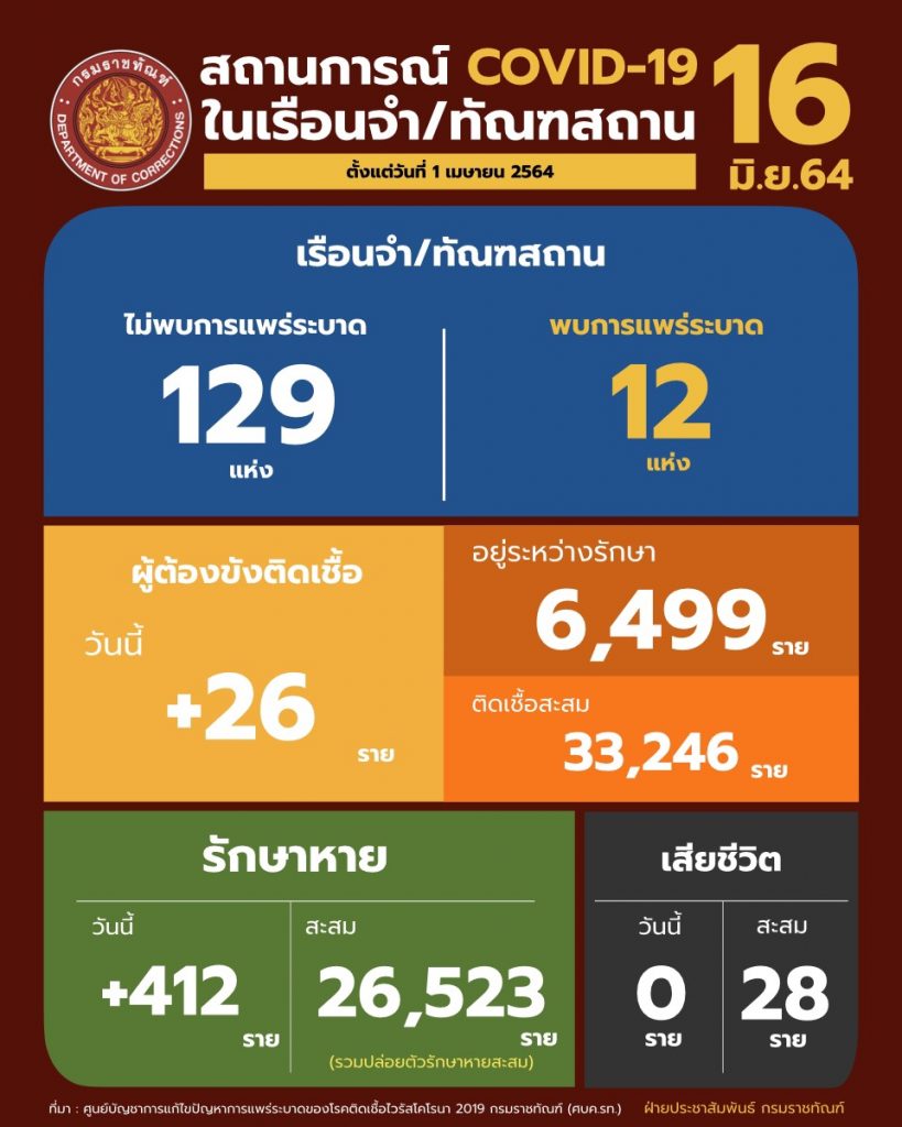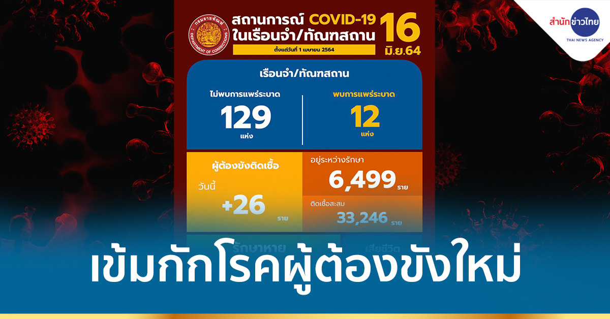 กรมราชทัณฑ์ 16 มิ.ย. -อธิบดีกรมราชทัณฑ์ เผยสถานการณ์โควิด -19 ในเรือนจำและทัณฑสถาน วันนี้มีผู้ต้องขังติดเชื้อใหม่ 26 ราย ไม่มีผู้เสียชีวิต เข้มกักโรคผู้ต้องขังเข้าใหม่