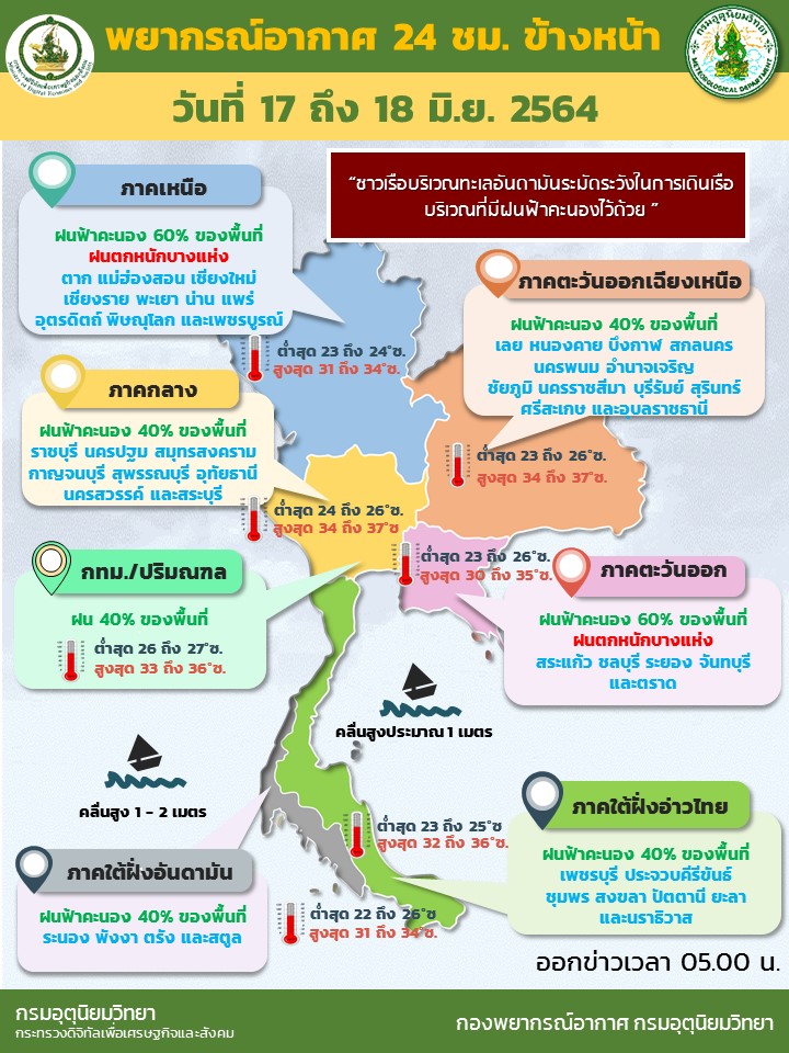 กรมอุตุนิยมวิทยา พยากรณ์อากาศ 24 ชั่วโมงข้างหน้า ประเทศไทยยังคงมีฝนฟ้าคะนองเกิดขึ้น และมีฝนตกหนักบางแห่งในภาคตะวันออก เนื่องจากมรสุมตะวันตกเฉียงใต้กำลังปานกลางพัดปกคลุมทะเลอันดามัน ประเทศไทย และอ่าวไทย ขอให้ประชาชนบริเวณดังกล่าวระวังอันตรายจากฝนตกหนักในระยะนี้