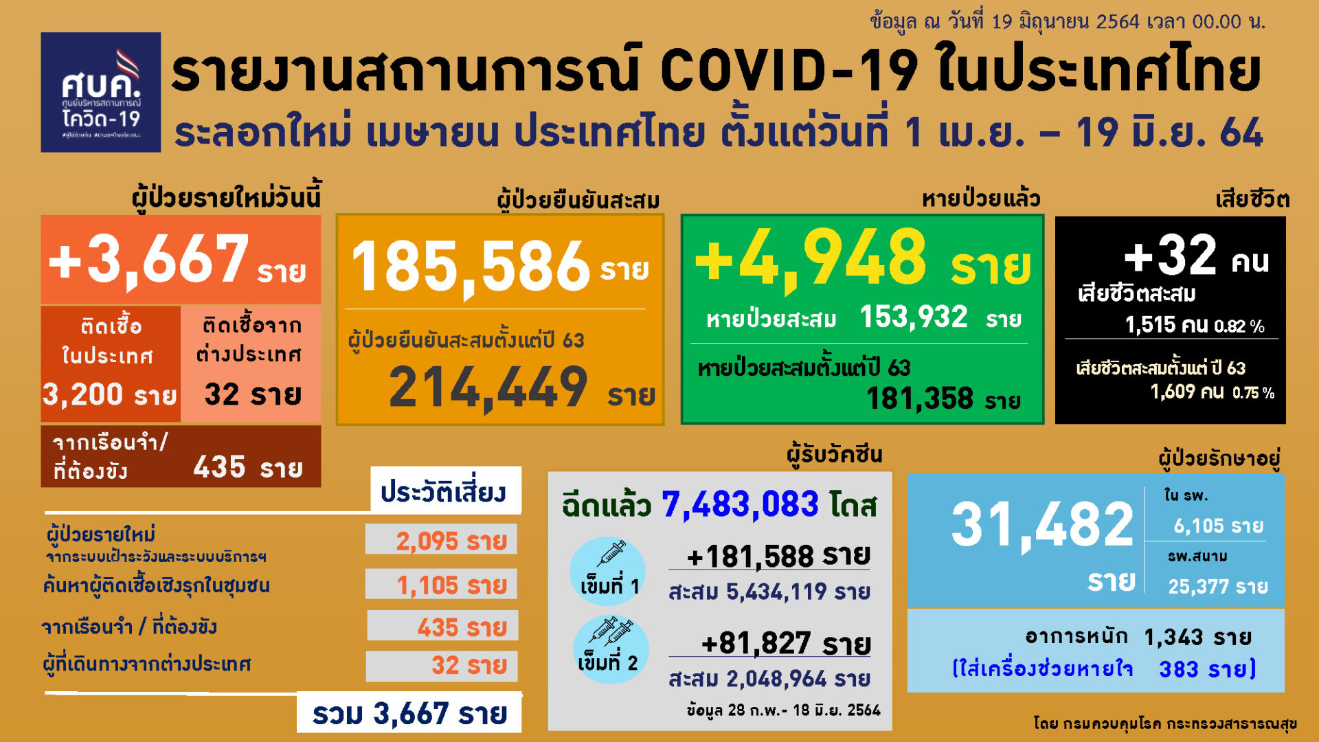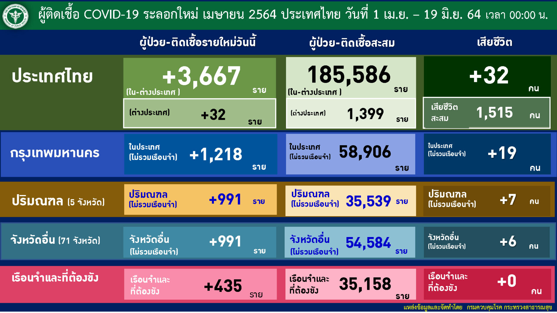 ศูนย์บริหารสถานการณ์โควิด-19 รายงานสถานการณ์โควิดประจำวันนี้ (19 มิ.ย.) ว่า มีผู้ติดเชื้อเพิ่มรวม 3,667 ราย จำแนกเป็น ติดเชื้อใหม่ 2,095 ราย ค้นหาเชิงรุกในชุมชน 1,105 ราย ติดเชื้อภายในเรือนจำ/ที่ต้องขัง 435 ราย และเดินทางมาจากต่างประเทศ 32 ราย คือ เอธิโอเปีย 3 ราย บาห์เรน 1 ราย แอฟริกาใต้ 1 ราย และกัมพูชา 27 ราย การติดเชื้อวันนี้ ส่วนใหญ่จาก กทม. ไม่รวมในเรือนจำ/ที่ต้องขัง 1,218 ราย ปริมณฑล 5 จังหวัด 991 ราย จังหวัดอื่นๆ 71 จังหวัด 991 ราย นอกจากนี้ ยังมีผู้ที่หายป่วยกลับบ้านได้แล้ว 4,948 ราย ผู้ป่วยสะสม 185,586 ราย (ตั้งแต่ 1 เมษายน 2564) และมีผู้เสียชีวิต 32 ราย เสียชีวิตสะสม 1,515 ราย