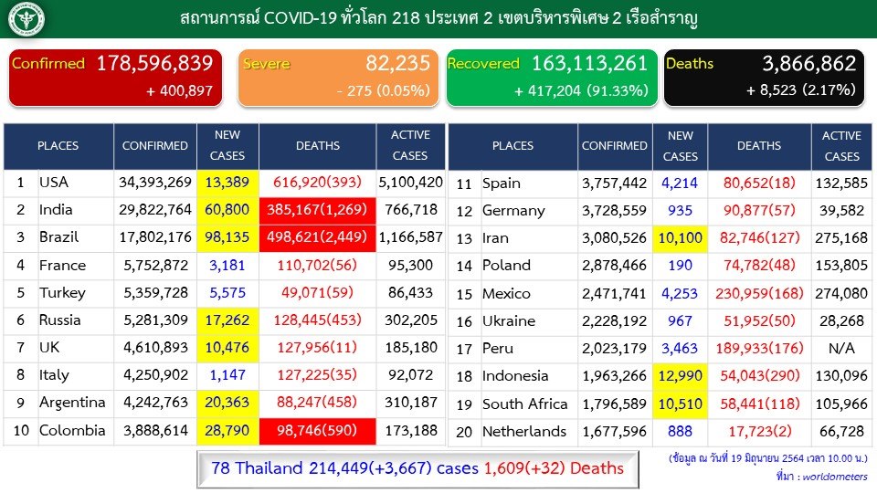 ขณะที่สถานการณ์โลก พบว่า 10 อันดับประเทศที่ติดเชื้อโควิด-19 สูงสุด คือ สหรัฐอเมริกา อินเดีย บราซิล ฝรั่งเศส ตุรกี รัสเซีย อังกฤษ อิตาลี อาร์เจนตินา และโคลอมเบีย ส่วนประเทศไทย อยู่อันดับที่ 78. – สำนักข่าวไทย