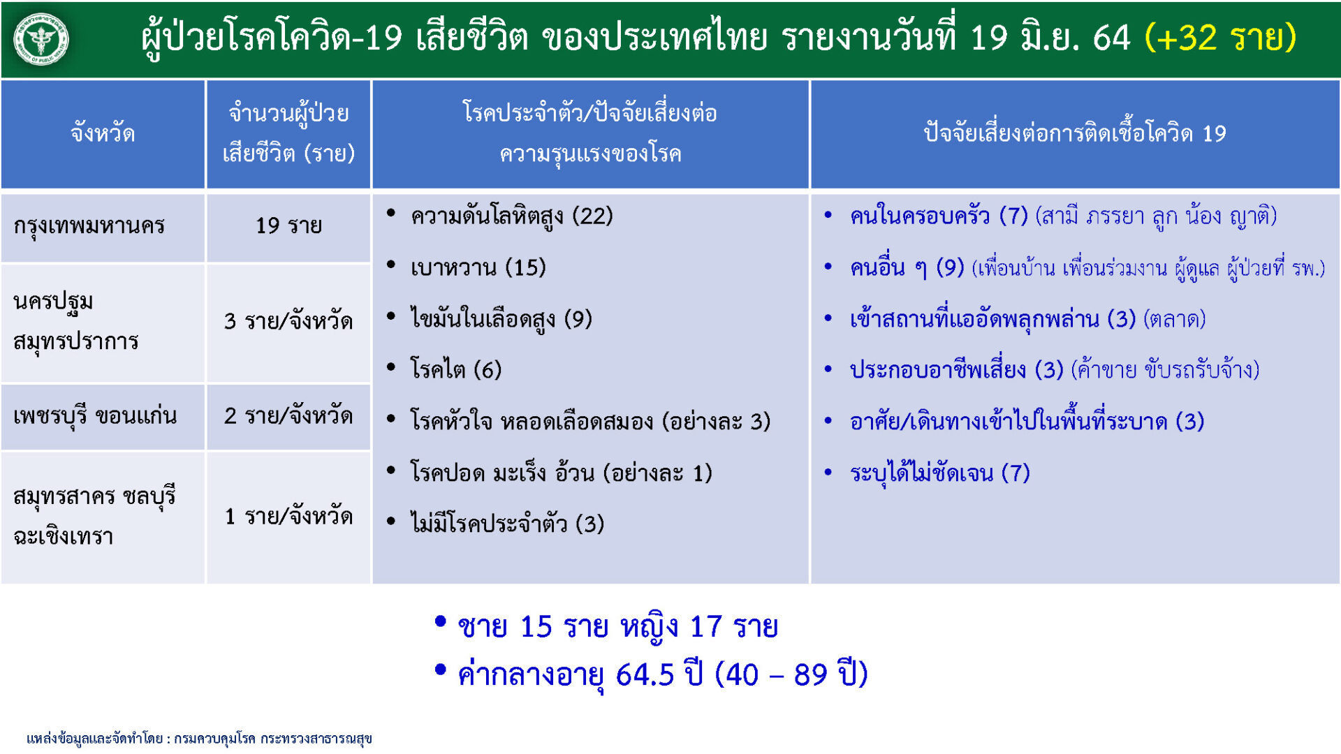 สำหรับผู้เสียชีวิต เป็นชาว กทม. 19 ราย นครปฐม สมุทรปราการ จังหวัดละ 3 ราย เพชรบุรี ขอนแก่น จังหวัดละ 2 ราย สมุทรสาคร ชลบุรี และฉะเชิงเทรา จังหวัดละ 1 ราย ต่างเป็นผู้ที่มีโรคประจำตัวที่มีปัจจัยเสี่ยงต่อความรุนแรงของโรค อาทิ ความดันโลหิตสูง เบาหวาน ไขมันในเลือดสูง ไต หัวใจ ปอด และอ้วน โดยติดมาจากคนในครอบครัว เพื่อนบ้าน เพื่อนร่วมงาน สถานที่แออัด ประกอบอาชีพเสี่ยง อาศัยหรือเดินทางไปพื้นที่ระบาด