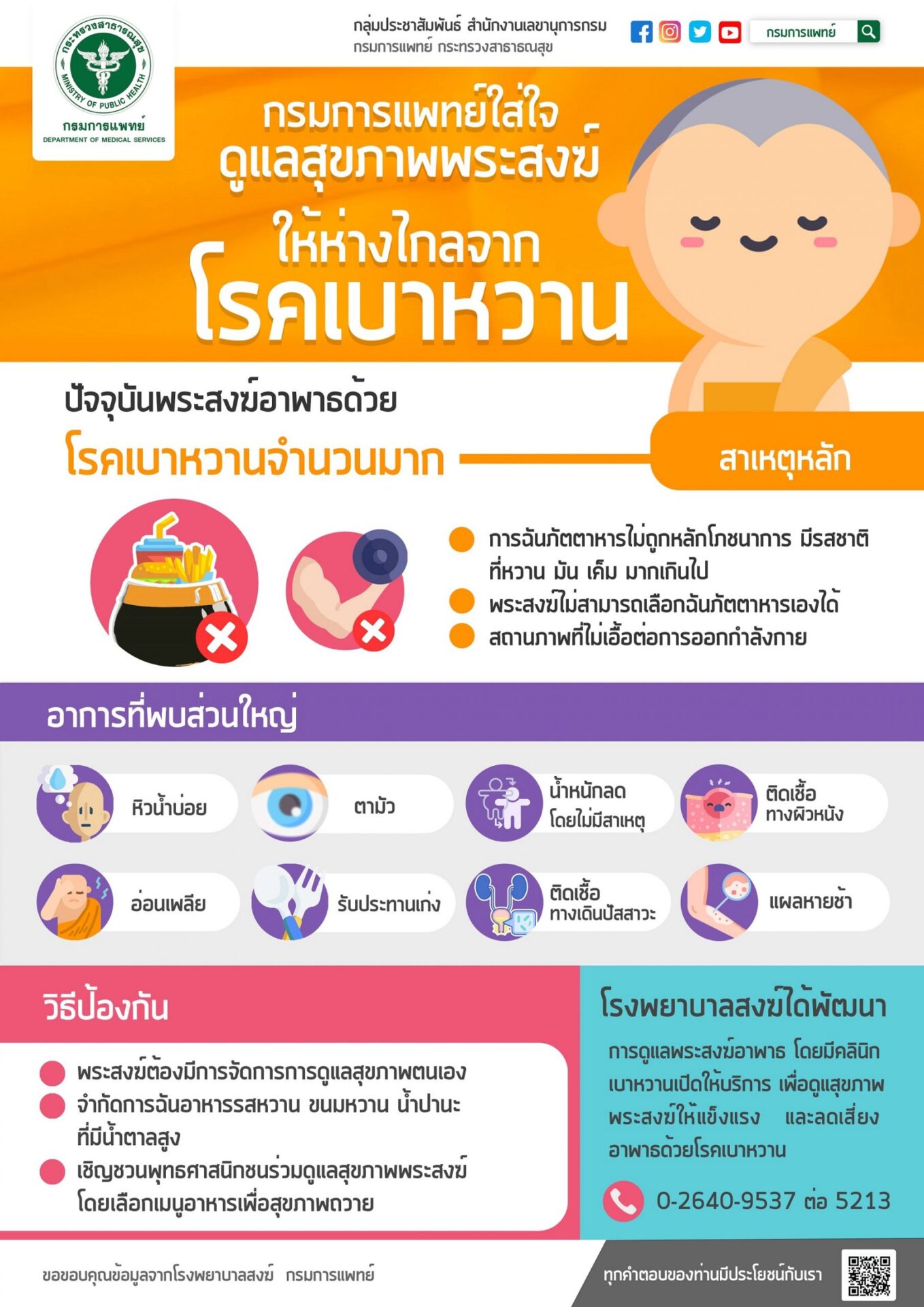 นพ.สมศักดิ์ อรรฆศิลป์ อธิบดีกรมการแพทย์ กระทรวงสาธารณสุข เปิดเผยว่า จากสถิติของโรงพยาบาลสงฆ์ พบพระภิกษุสงฆ์อาพาธเข้ารับการรักษาด้วยโรคไม่ติดต่อเรื้อรังเพิ่มมากขึ้นทุกปี โดยปี 2563 พบพระภิกษุสงฆ์อาพาธด้วยโรค เบาหวานจำนวน 2,133 รูป ซึ่งเป็นโรคที่ตรวจพบระดับน้ำตาลในเลือดสูง จากการที่ตับอ่อนมีความบกพร่องในการสร้างอินซูลิน หรือมีความผิดปกติของการออกฤทธิ์ของอินซูลิน หรือมีความบกพร่องทั้งสองร่วมกัน ทำให้ร่างกายไม่สามารถนำน้ำตาลไปใช้ให้เกิดพลังงานได้ ส่งผลให้อวัยวะต่าง ๆ เสื่อมสมรรถภาพ และเกิดเป็นโรคแทรกซ้อนจากเบาหวานได้ เช่น โรคตา จอประสาทตาเสื่อม โรคไตเสื่อม ไตวาย เป็นต้น