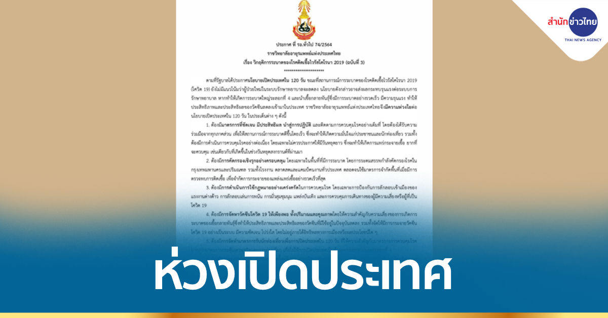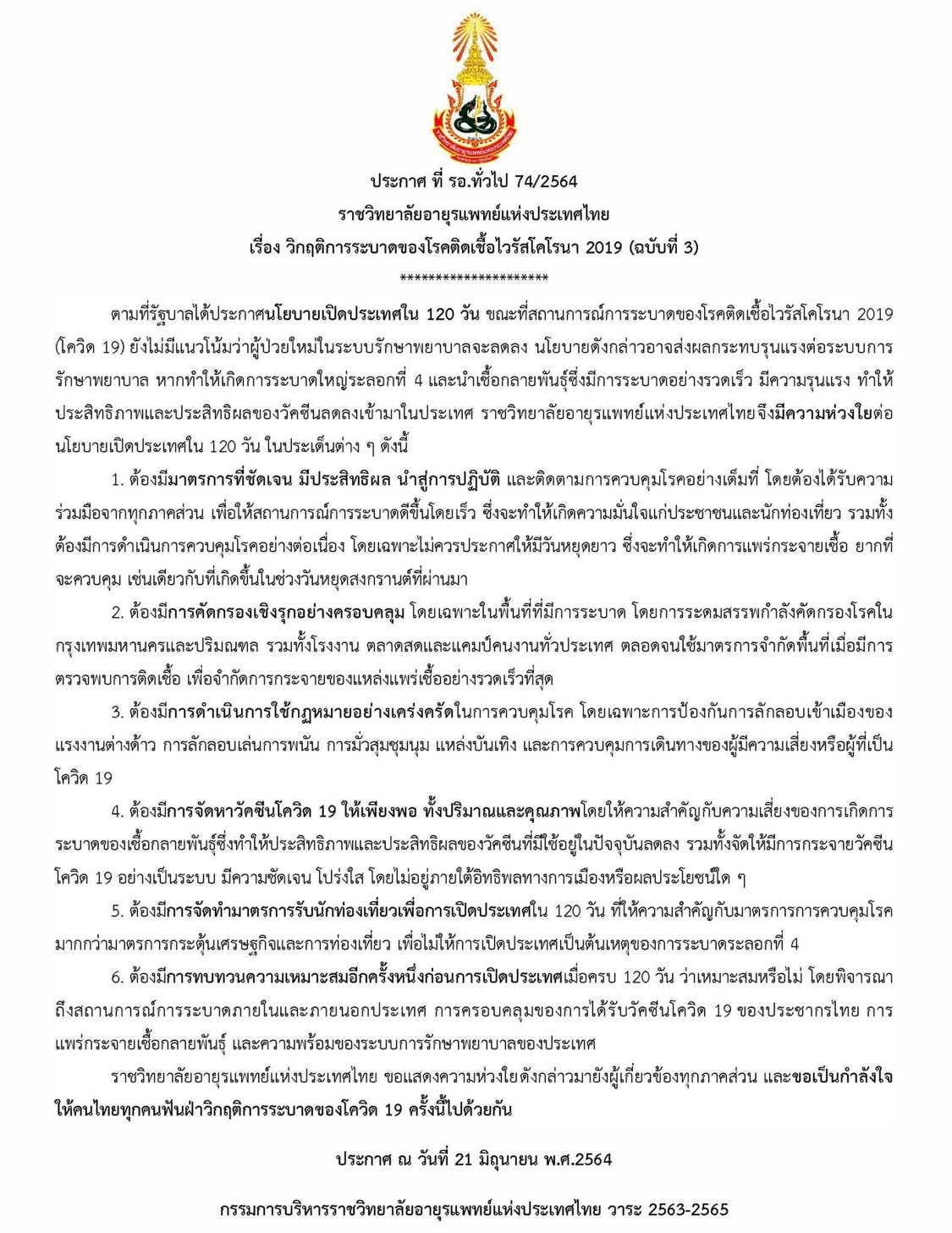 เพจเฟซบุ๊ก ราชวิทยาลัยอายุรแพทย์แห่งประเทศไทย โพสต์ประกาศ ที่ รอ.ทั่วไป 74/2564 ราชวิทยาลัยอายุรแพทย์แห่งประเทศไทย เรื่องวิกฤติการระบาดของโรคติดเชื้อไวรัสโคโรนา 2019 (ฉบับที่ 3) ว่า ตามที่รัฐบาลได้ประกาศนโยบายเปิดประเทศใน 120 วัน ขณะที่สถานการณ์การระบาดของโรคติดเชื้อไวรัสโคโรนา 2019 (โควิด 19) ยังไม่มีแนวโน้มว่าผู้ป่วยใหม่ในระบบรักษาพยาบาลจะลดลง นโยบายดังกล่าวอาจส่งผลกระทบรุนแรงต่อระบบการรักษาพยาบาล หากทำให้เกิดการระบาดใหญ่ระลอกที่ 4 และนำเชื้อกลายพันธุ์ซึ่งมีการระบาดอย่างรวดเร็ว มีความรุนแรง ทำให้ประสิทธิภาพและประสิทธิผลของวัคซีนลดลงเข้ามาในประเทศ ราชวิทยาลัยอายุรแพทย์แห่งประเทศไทยจึงมีความห่วงใยต่อนโยบายเปิดประเทศใน 120 วัน ในประเด็นต่าง ๆ ดังนี้