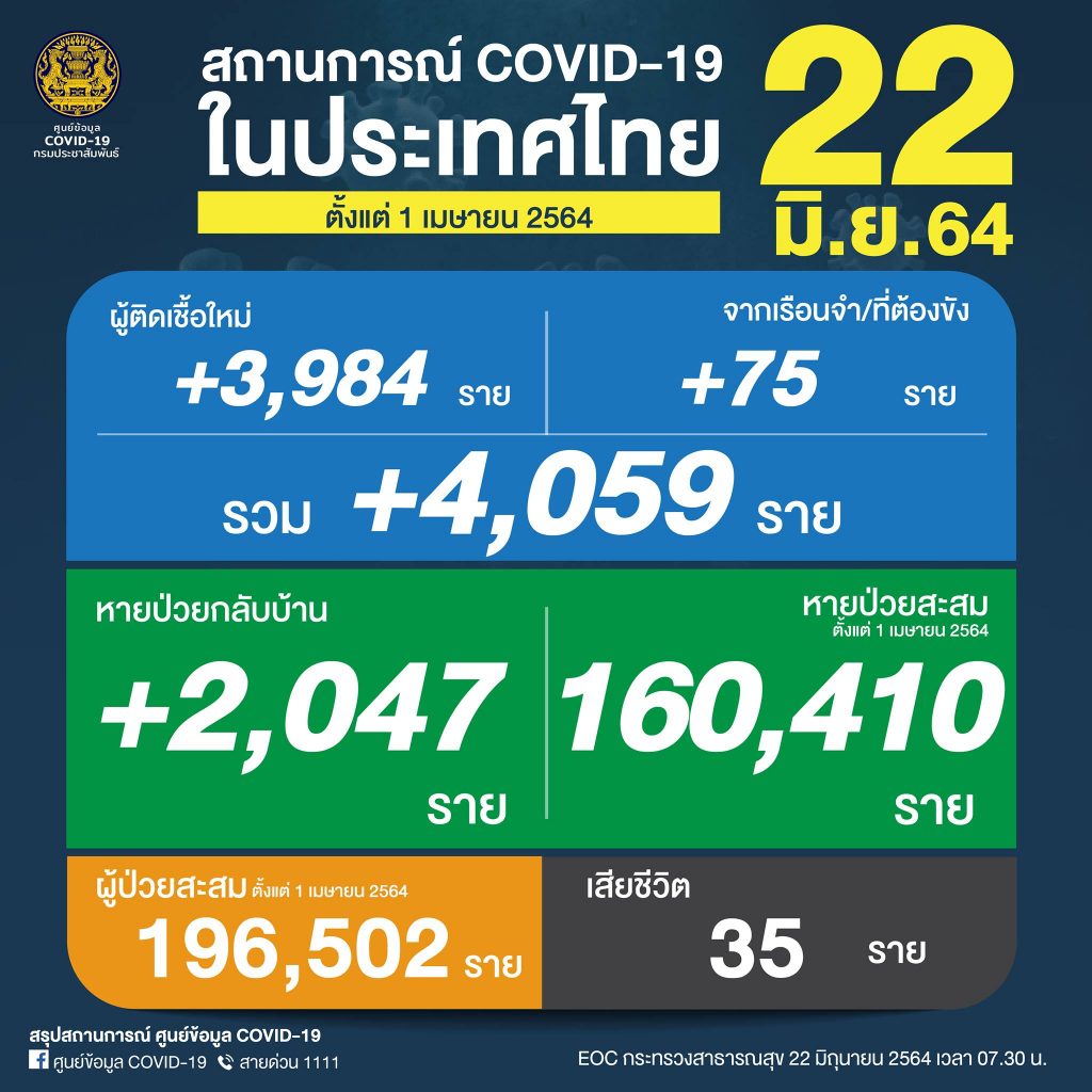 กรุงเทพฯ 22 มิ.ย.-โควิดวันนี้ ยอดผู้ติดเชื้อรวม 4,059 ราย ยืนยันสะสม 196,502 ราย (ตั้งแต่ 1 เมษายน) หายป่วยกลับบ้าน 2,047 ราย เสียชีวิตเพิ่ม 35 ราย