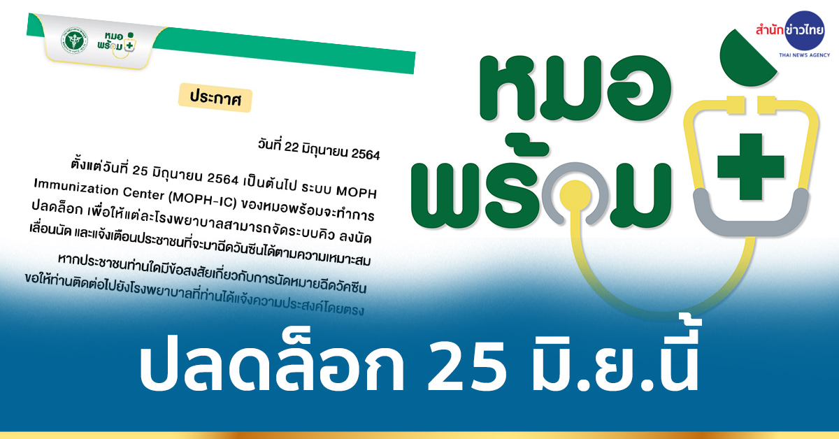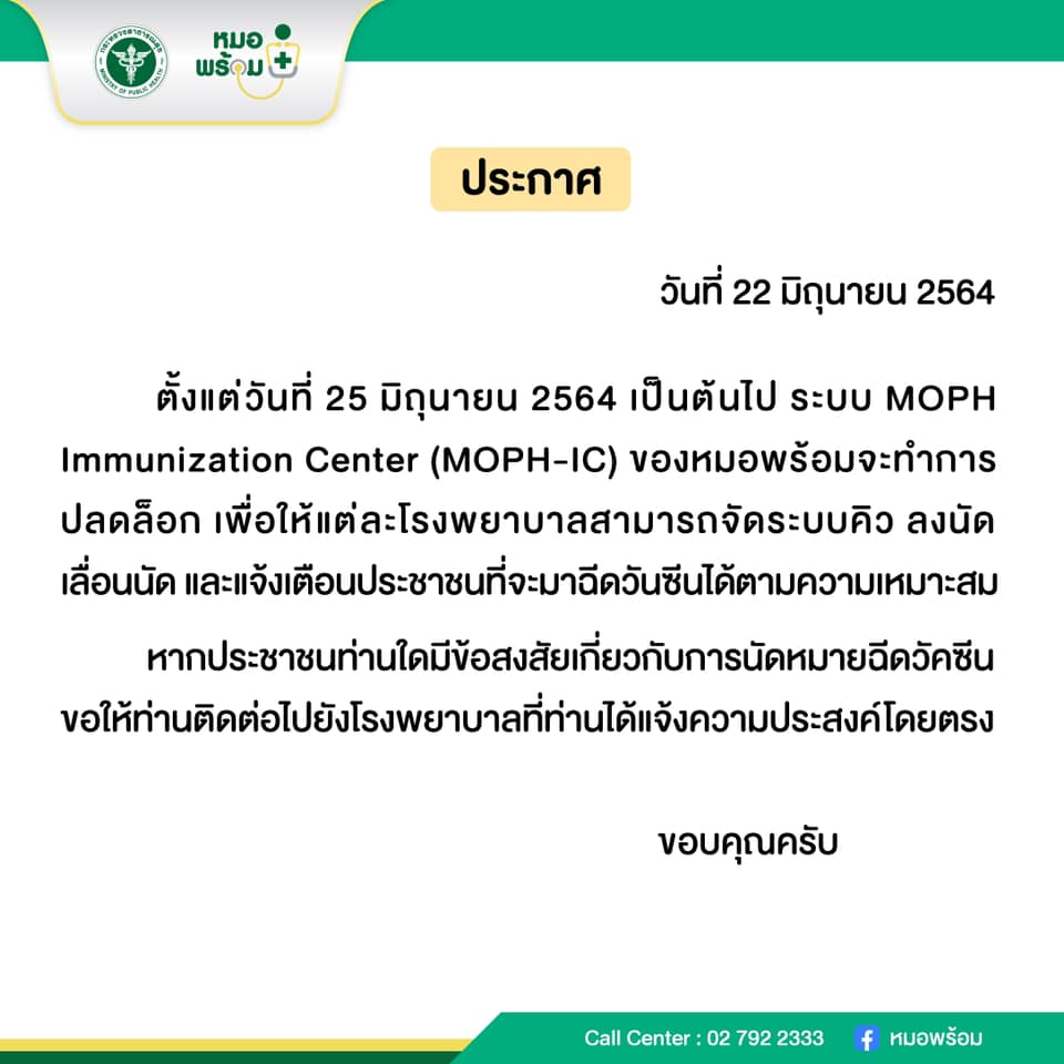 “หมอพร้อม” ประกาศผ่านเพจเฟซบุ๊ก ตั้งแต่วันที่ 25 มิถุนายน 2564 เป็นต้นไป ระบบ MOPH Immunization Center (MOPH-IC) ของหมอพร้อมจะทำการปลดล็อก เพื่อให้แต่ละโรงพยาบาลสามารถจัดระบบคิว ลงนัด เลื่อนนัด และแจ้งเตือนประชาชนที่จะมาฉีดวันซีนได้ตามความเหมาะสม Call Center : 02 792 2333