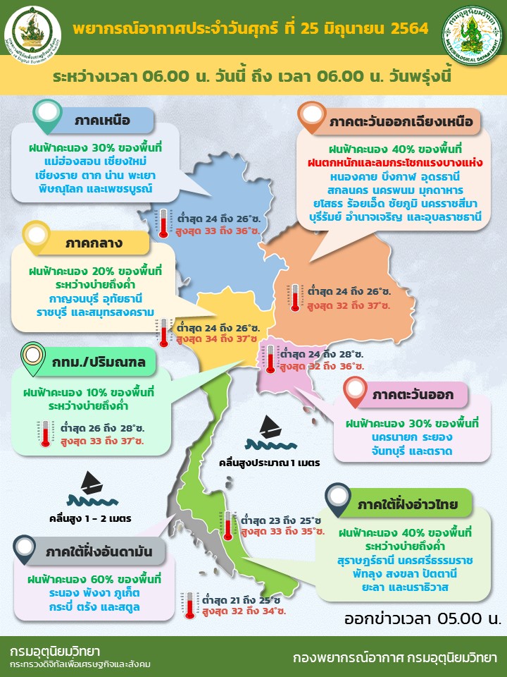 กรมอุตุนิยมวิทยา พยากรณ์อากาศ 24 ชั่วโมงข้างหน้า มรสุมตะวันตกเฉียงใต้พัดปกคลุมทะเลอันดามัน ประเทศไทย และอ่าวไทย ประกอบกับยังคงมีหย่อมความกดอากาศต่ำปกคลุมประเทศลาวและเวียดนามตอนบน ลักษณะเช่นนี้ทำให้บริเวณประเทศไทยตอนบน มีการกระจายของฝนน้อย เว้นแต่บริเวณรับลมมรสุมตะวันตกเฉียงใต้ และภาคตะวันออกเฉียงเหนือ ส่วนคลื่นลมบริเวณทะเลอันดามันและอ่าวไทยตอนบน มีคลื่นสูง 1-2 เมตร บริเวณที่มีฝนฟ้าคะนอง คลื่นสูงประมาณ 2 เมตร