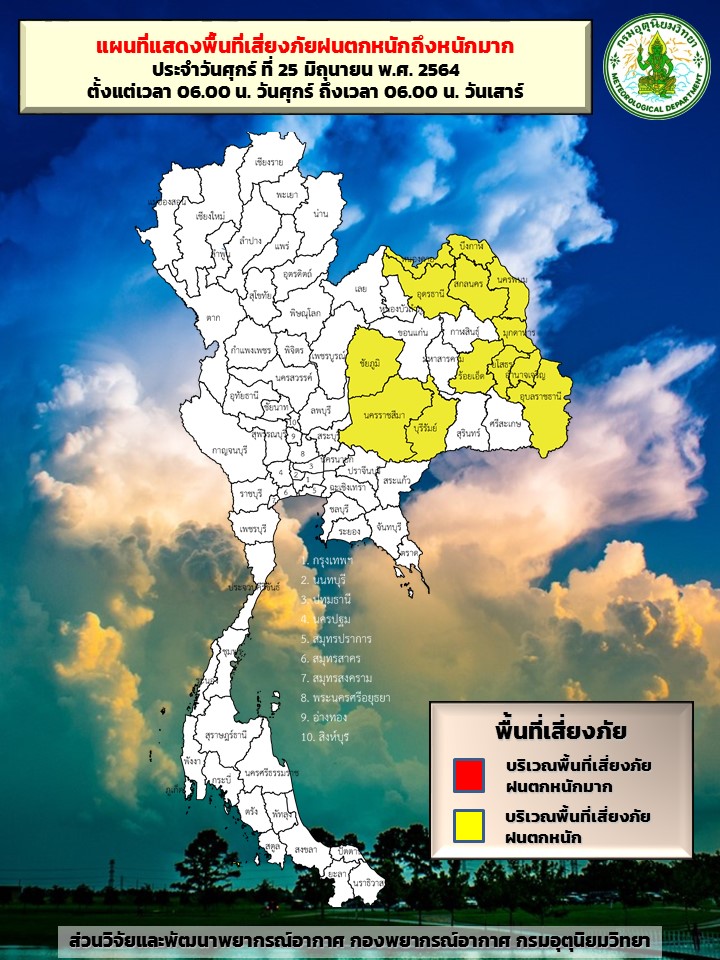 กรมอุตุฯ 25 มิ.ย. – กรมอุตุฯ เผยไทยตอนบนมีการกระจายของฝนน้อย เว้นบริเวณรับลมมรสุมตะวันตกเฉียงใต้ และภาคอีสาน ส่วนกรุงเทพฯ-ปริมณฑล ฝนฟ้าคะนอง 10% ของพื้นที่ ช่วงบ่าย-ค่ำ