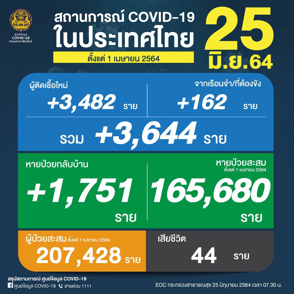 กรุงเทพฯ 25 มิ.ย.-โควิดวันนี้ ยอดผู้ติดเชื้อรวม 3,644 ราย ยืนยันสะสม 207,428 ราย (ตั้งแต่ 1 เมษายน) หายป่วยกลับบ้าน 1,751 ราย เสียชีวิตเพิ่ม 44 ราย