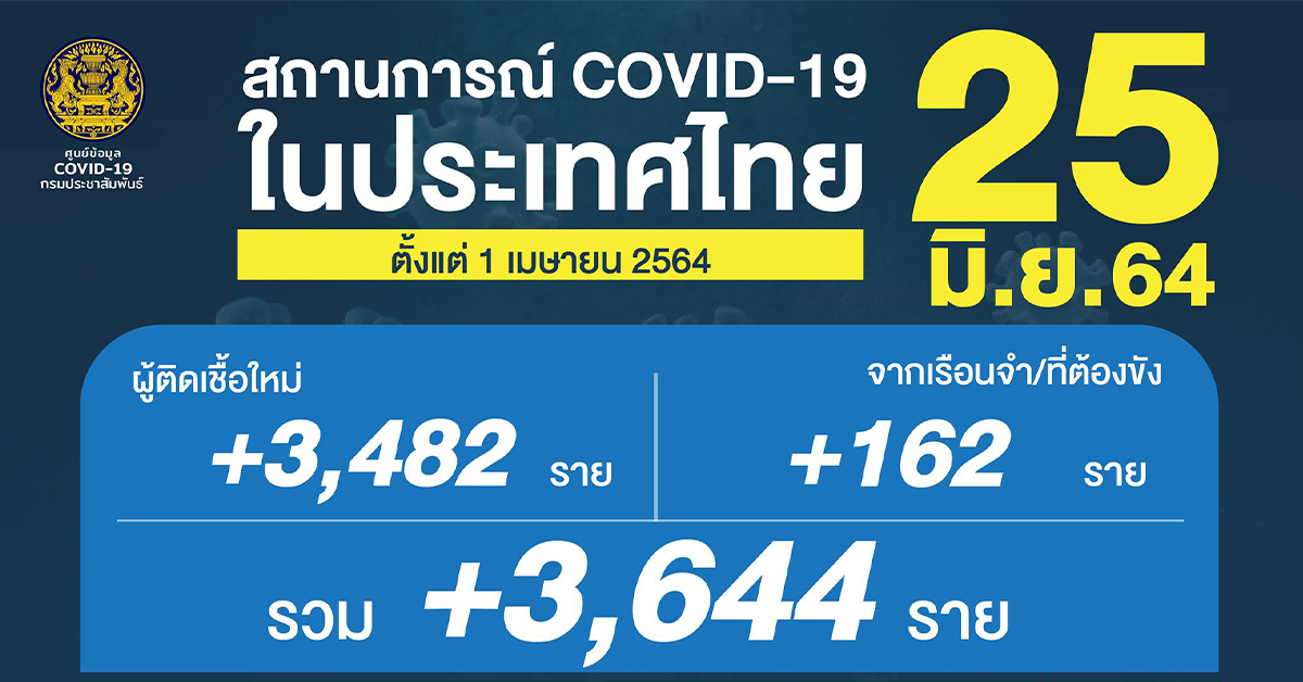 EOC กระทรวงสาธารณสุข รายงานสถานการณ์การติดเชื้อโควิด-19 รายใหม่ วันนี้ (25 มิ.ย.) พบยอดผู้ติดเชื้อใหม่รวม 3,644 ราย จำแนกเป็นติดเชื้อใหม่ 3,482 ราย ติดเชื้อภายในเรือนจำ/ที่ต้องขัง 162 ราย ยืนยันสะสม 207,428 ราย (ตั้งแต่ 1 เมษายน) หายป่วยกลับบ้าน 1,751 ราย มีผู้เสียชีวิตเพิ่ม 44 ราย ทั้งนี้ เวลา 12.30 น. ศบค. จะแถลงรายละเอียดอย่างเป็นทางการอีกครั้ง .-สำนักข่าวไทย
