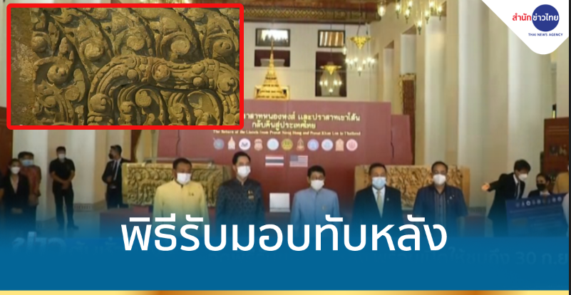 กรุงเทพฯ 25 มิ.ย.-กระทรวงวัฒนธรรม จัดพิธีรับมอบทับหลังปราสาทหนองหงส์ จังหวัดบุรีรัมย์ และทับหลังปราสาทเขาโล้น จังหวัดสระแก้ว โดยมีนายวิษณุ เครืองาม รองนายกรัฐมนตรี เป็นประธานพิธีรับมอบ และอุปทูตรักษาการแทนเอกอัครราชทูตสหรัฐอเมริกาประจำประเทศไทย เข้าร่วมในพิธีด้วย พร้อมกันนี้ได้จัดแสดงนิทรรศการพิเศษ “ทับหลังปราสาทหนองหงส์ และปราสาทเขาโล้น กลับคืนสู่ประเทศไทย” เพื่อกระตุ้นจิตสำนึกรักและหวงแหนและร่วมกันปกป้องมรดกวัฒนธรรมของไทย ณ พระที่นั่งอิศราวินิจฉัย พิพิธภัณฑสถานแห่งชาติ พระนคร ตั้งแต่บัดนี้ถึงวันที่ 30 กันยายน 2564 ทุกวันพุธ – วันอาทิตย์ เวลา 09.00-16.00 น. .-สำนักข่าวไทย