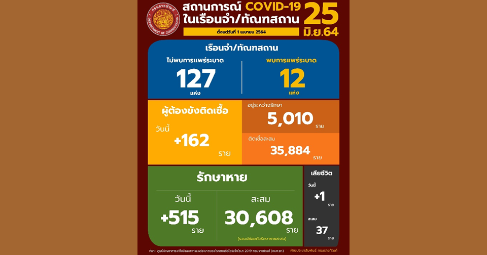 นายอายุตม์ สินธพพันธุ์ อธิบดีกรมราชทัณฑ์ เผยสถานการณ์การแพร่ระบาดของโรคติดเชื้อไวรัสโควิด-19 ในเรือนจำและทัณฑสถาน (ข้อมูล ณ วันที่ 24 มิถุนายน 2564 เวลา 16.00 นาฬิกา) มีผู้ต้องขังติดเชื้อรายใหม่ จำนวน 162 ราย รักษาหายวันนี้ 515 รายเสียชีวิต 1 ราย ทำให้มีผู้ต้องขังติดเชื้อที่ยังอยู่ในการดูแลของกรมราชทัณฑ์ 5,010 ราย