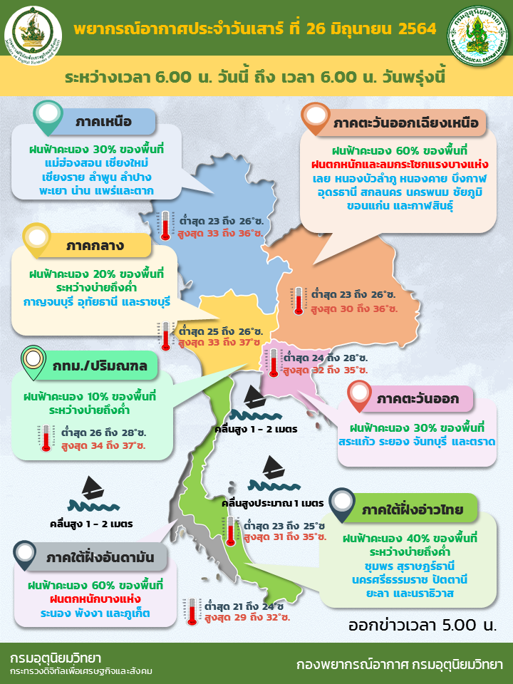 กรมอุตุนิยมวิทยา พยากรณ์อากาศ 24 ชั่วโมงข้างหน้า หย่อมความกดอากาศต่ำปกคลุมบริเวณประเทศลาวและเวียดนามตอนบน ลักษณะเช่นนี้ทำให้บริเวณภาคตะวันออกเฉียงเหนือมีฝนตกหนักบางพื้นที่ ในขณะที่มรสุมตะวันตกเฉียงใต้ยังคงพัดปกคลุมทะเลอันดามัน ประเทศไทย และอ่าวไทย ลักษณะเช่นนี้ทำให้บริเวณภาคเหนือ ภาคกลาง และภาคตะวันออก มีการกระจายของฝนน้อย ส่วนภาคใต้ฝั่งตะวันตกยังคงมีฝนตกหนักบางแห่ง ส่วนคลื่นลมบริเวณทะเลอันดามันและอ่าวไทยตอนบนมีคลื่นสูง 1-2 เมตร บริเวณที่มีฝนฟ้าคะนองคลื่นสูงประมาณ 2 เมตร