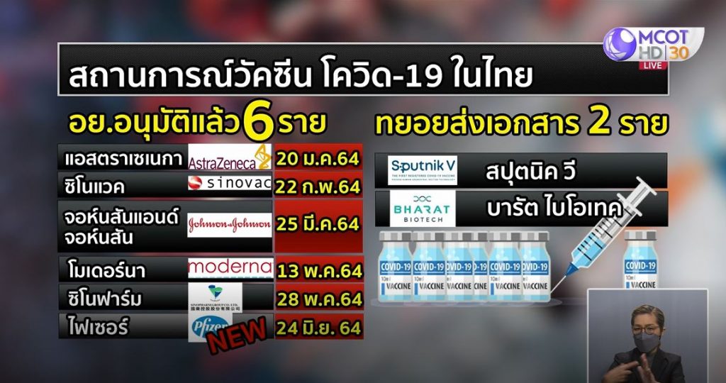 ล่าสุด อย. อนุมัติขึ้นทะเบียนวัคซีนไฟเซอร์ ถือเป็นวัคซีนโควิด-19 รายการที่ 6 ของไทย เป็นที่เรียบร้อยแล้ว หลังจาก อย. อนุมัติวัคซีนโควิด-19 ไปแล้ว 5 ราย ได้แก่ 1.วัคซีนแอสตราเซนเนกา 2.วัคซีนซิโนแวค 3.วัคซีนจอห์นสัน แอนด์ จอห์นสัน 4.วัคซีนโมเดอร์นา 5.วัคซีนของซิโนฟาร์ม