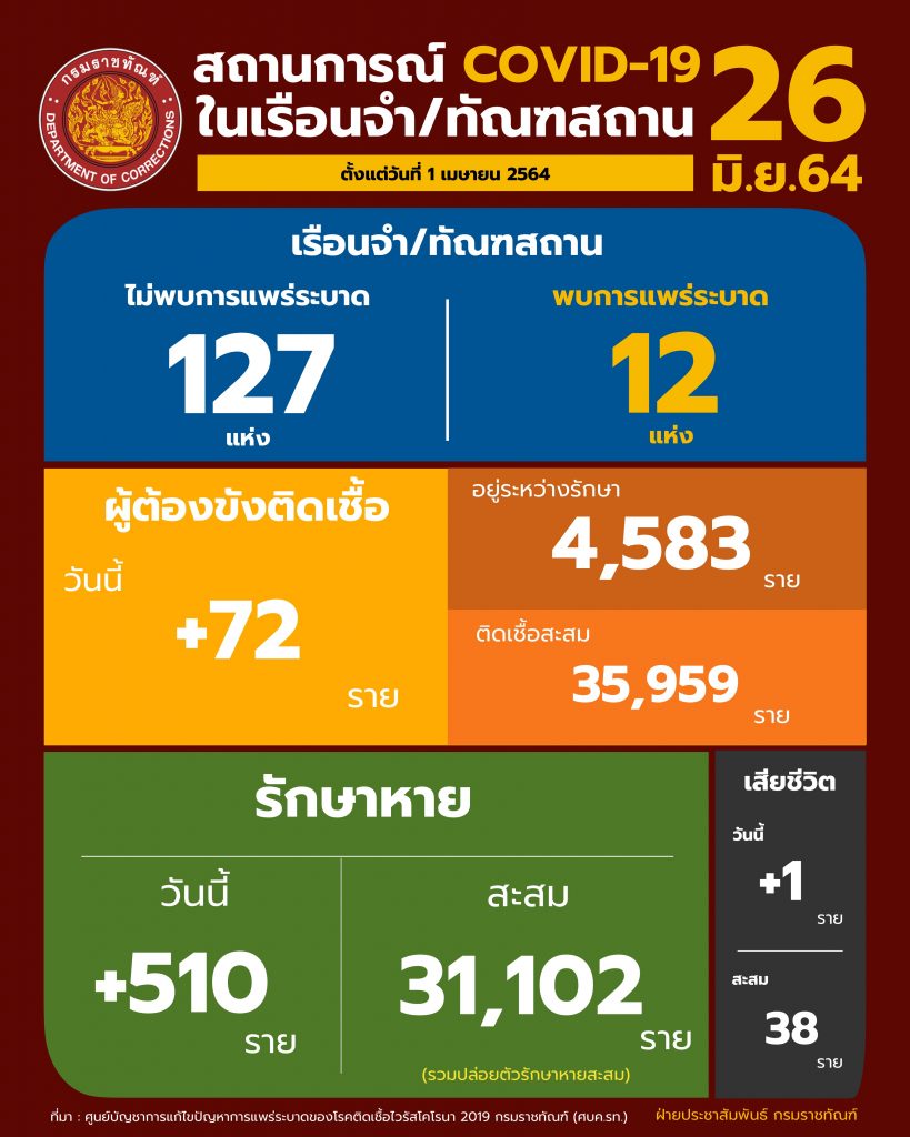 นายอายุตม์ สินธพพันธุ์ อธิบดีกรมราชทัณฑ์ เผยสถานการณ์การแพร่ระบาดของโรคติดเชื้อไวรัสโควิด-19 ในเรือนจำและทัณฑสถาน (ข้อมูล ณ วันที่ 25 มิ.ย.64 เวลา 16.00 น.) มีผู้ต้องขังติดเชื้อรายใหม่ จำนวน 72 ราย รักษาหายวันนี้ 510 ราย เสียชีวิต 1 ราย ทำให้มีผู้ต้องขังติดเชื้อที่ยังอยู่ในการดูแลของกรมราชทัณฑ์ 4,583 ราย สถานการณ์การแพร่ระบาดในวันนี้ ยังคงมีเรือนจำสีขาวที่ไม่พบการแพร่ระบาดคงที่ จำนวน 127 แห่ง ส่วนเรือนจำสีแดงที่พบการแพร่ระบาดอยู่ที่ 12 แห่งคงเดิม โดยรายงานผู้ติดเชื้อในวันนี้ เป็นการติดเชื้อจากแดนในของเรือนจำสีแดง จำนวน 44 ราย และการตรวจพบเชื้อในห้องแยกกักโรค ซึ่งเป็นผู้ต้องขังรับใหม่ 28 ราย จากเรือนจำพิเศษมีนบุรี เรือนจำจังหวัดสตูล เรือนจำอำเภอธัญบุรี และทัณฑสถานบำบัดพิเศษสงขลา ขณะที่จำนวนผู้ป่วยรักษาหายยังเพิ่มขึ้นและมากกว่าผู้ติดเชื้อรายใหม่ รวมรักษาหายสะสมอยู่ที่ 31,102 ราย หรือ 86% ของจำนวนผู้ป่วยสะสม ทำให้ผู้ติดเชื้อในการดูแลของกรมราชทัณฑ์ลดลงเหลือต่ำกว่า 5 พันรายเป็นวันแรก คือ 4,583 ราย เป็นกลุ่มสีเขียว 4,037 ราย สีเหลือง 519 ราย และสีแดง 27 ราย ขณะที่มีรายงานผู้เสียชีวิตวันนี้ จำนวน 1 ราย รวมเสียชีวิต 38 ราย หรือ 0.1% ของผู้ติดเชื้อสะสมทั้งหมด