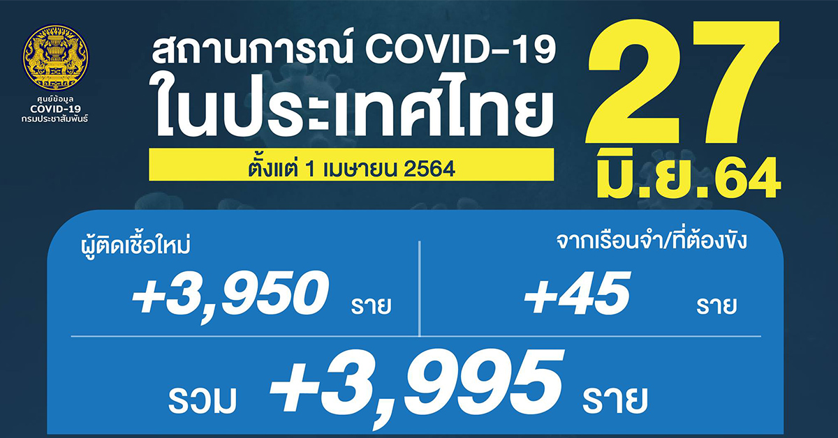EOC กระทรวงสาธารณสุข รายงานสถานการณ์การติดเชื้อโควิด-19 รายใหม่ วันนี้ (27 มิ.ย.) พบยอดผู้ติดเชื้อใหม่รวม 3,995 ราย จำแนกเป็นติดเชื้อใหม่ 3,950 ราย ติดเชื้อภายในเรือนจำ/ที่ต้องขัง 45 ราย ยืนยันสะสม 215,584 ราย (ตั้งแต่ 1 เมษายน) หายป่วยกลับบ้าน 2,253 ราย มีผู้เสียชีวิตเพิ่ม 42 ราย .-สำนักข่าวไทย