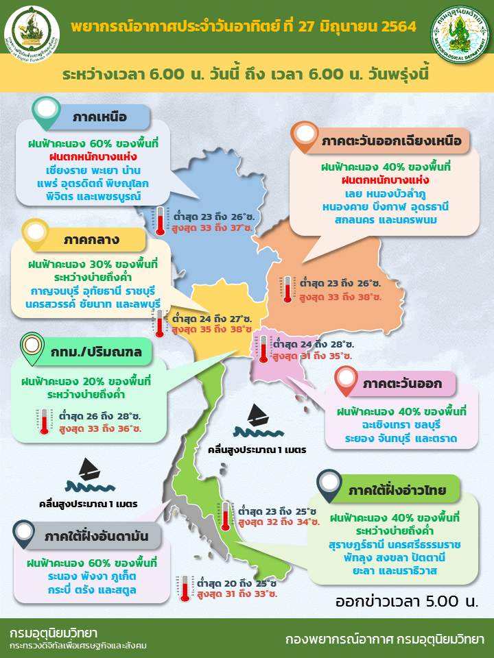 กรุงเทพฯ 27 มิ.ย.-กรมอุตุฯ เผยภาคเหนือ-อีสาน ฝนตกหนักบางพื้นที่ ส่วนภาคใต้ฝนฟ้าคะนอง ทะเลคลื่นสูง กทม.-ปริมณฑล ฝนร้อยละ 20 ช่วงบ่ายถึงค่ำ