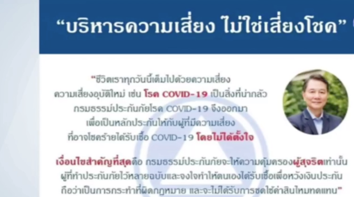 นายอานนท์ วังวสุ นายกสมาคมประกันวินาศภัยไทย เผยถึงกรณีที่มีกระแสข่าวในโลกโซเชียล “ติดโควิดอยากได้เงินประกัน” ว่ากรมธรรม์ประกันภัยโรค COVID-19 เป็นหลักประกันให้กับผู้ที่มีความเสี่ยงที่อาจโชคร้ายได้รับเชื้อ COVID-19 โดยไม่ได้ตั้งใจ ซึ่งเงื่อนไขที่สำคัญที่สุดคือ กรมธรรม์ประกันภัยจะให้ความคุ้มครองผู้สุจริตเท่านั้น สำหรับผู้ที่ทำประกันภัยไว้หลายฉบับและจงใจทำให้ตนเองได้รับเชื้อเพื่อหวังเงินประกัน ถือว่าเป็นการกระทำที่ผิดกฎหมาย และจะไม่ได้รับการชดใช้ค่าสินไหมทดแทน