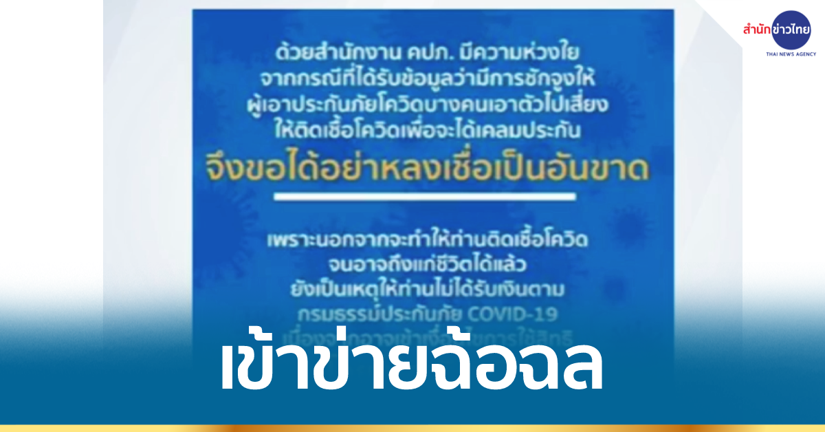 กรุงเทพฯ 27 มิ.ย.- สมาคมประกันวินาศภัยไทย เตือนคนตั้งใจเสี่ยงติดโควิด-19 หวังเอาเงินสินไหม ย้ำอย่าทำหรือหลงเชื่อ เพราะไม่ได้เงินแถมโทษทางอาญาจำคุกไม่เกิน 3 ปี