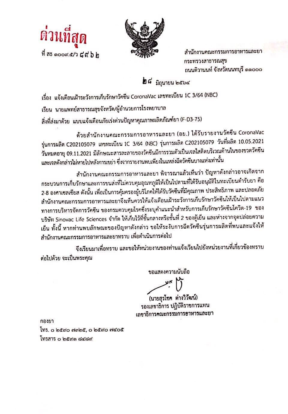 นพ.สุรโชค ต่างวิวัฒน์ รองเลขาธิการ อย.แถลงข่าวชี้แจงกรณีพบเจลใสในขวดวัคซีนซิโนแวค และการออกหนังสือแจ้งเตือนการจัดเก็บวัคซีนให้เป็นตามาตรฐานว่า การพบวัคซีนซิโนแวคเป็นเจลนั้น พบเพียงจุดฉีดเดียวใน กทม. โดยพบว่าการเกิดเป็นเจลใสนี้มี 110 ขวด และไม่ได้ทำการฉีดให้กับประชาชน โดยเจ้าหน้าที่มีการเก็บและส่งให้ส่วนกลางทันที และส่งกรมวิทยาศาสตร์การแพทย์ตรวจสอบ ไม่พบว่ามีปัญหาเรื่องของคุณภาพวัคซีน หรือมีปัญหาในรุ่นการผลิตเดียวกัน ที่ C202105079 เลขทะเบียน 1C 3/64 (NBC) รุ่นการผลิต C202105079 วันที่ผลิต 10.05.2021. วันหมดอายุ 09.11.2021 โดยสารที่เกิดเป็นเจลใส คืออะลูมินัมที่ใช้ในวัคซีนเชื้อตาย ซึ่งเป็นสารมาตรฐานและมีความปลอดภัย