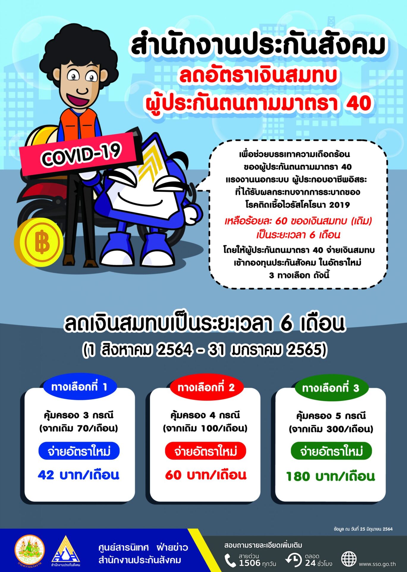 นายทศพล กฤตวงศ์วิมาน เลขาธิการสำนักงานประกันสังคม กระทรวงแรงงาน เปิดเผยว่า ตามมติคณะรัฐมนตรี (ครม.)มีมติเห็นชอบหลักการลดอัตราเงินสมทบประกันสังคมของผู้ประกันตนตามมาตรา 40 เพื่อบรรเทาความเดือดร้อนผู้ประกันตน ซึ่งเป็นแรงงานนอกระบบ ผู้ประกอบอาชีพอิสระที่ได้รับผลกระทบจากสถานการณ์โควิด-19 ให้เหลือร้อยละ 60 ของเงินสมทบ (เดิม) เป็นระยะเวลา 6 เดือน โดยเมื่อวันที่ 24 มิ.ย.64 ราชกิจจานุเบกษาได้ประกาศพระราชกฤษฎีกาว่าด้วยกำหนดหลักเกณฑ์และอัตราการจ่ายเงินสมทบประเภทของประโยชน์ทดแทน ตลอดจนหลักเกณฑ์และเงื่อนไขแห่งสิทธิในการรับประโยชน์ทดแทนของบุคคลซึ่งสมัครเป็นผู้ประกันตน และมีผลบังคับใช้แล้ว