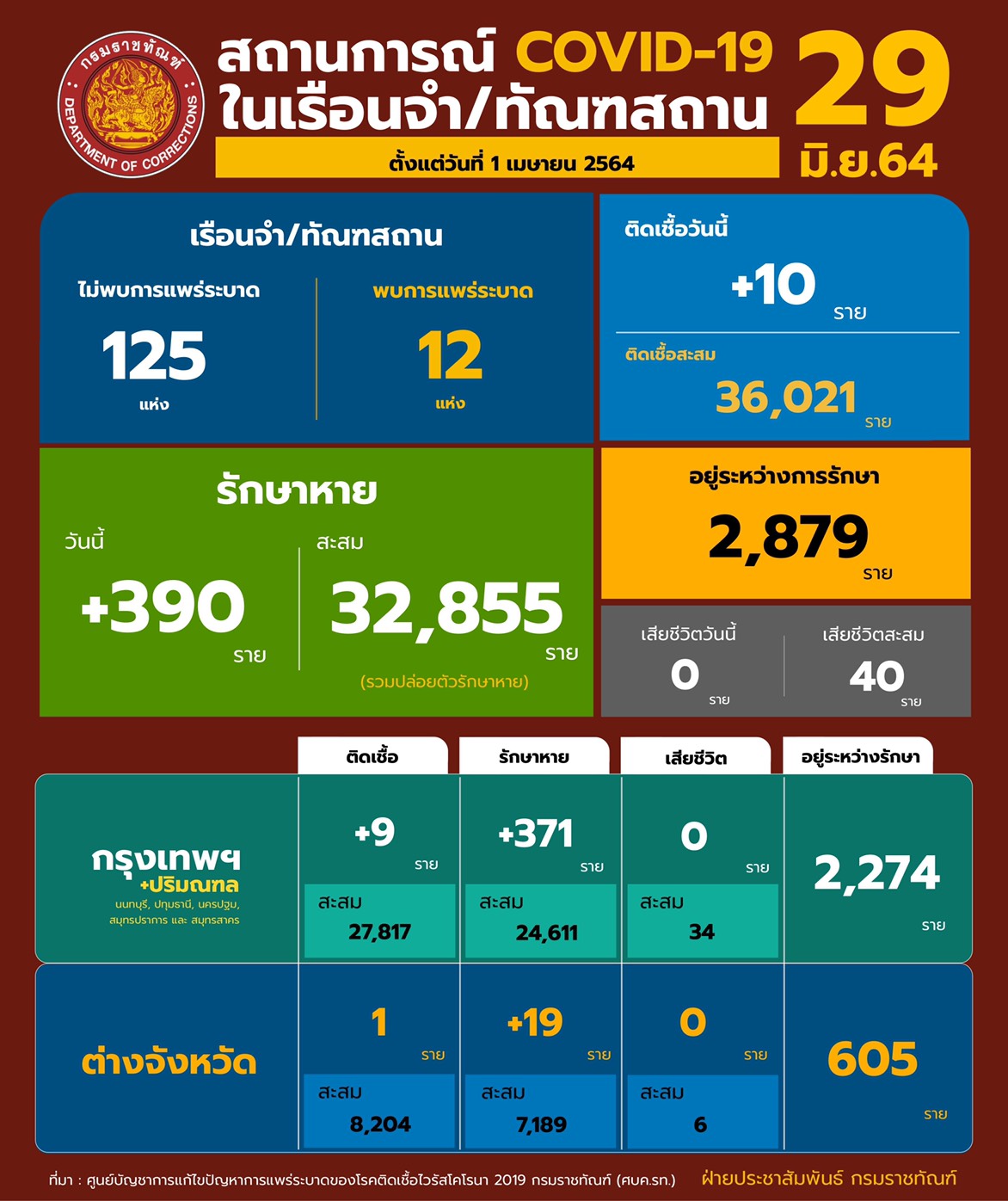 กรมราชทัณฑ์ 29 มิ.ย.-ราชทัณฑ์ รายงานพบผู้ต้องขังติดเชื้อรายใหม่เพียง 10 ราย รวมที่ยังอยู่ในการดูแล 2,879 ราย ขณะเดียวกัน เร่งค้นหาผู้ต้องขังติดโควิด พร้อมคุมการระบาดในเรือนจำสมุทรสาคร
