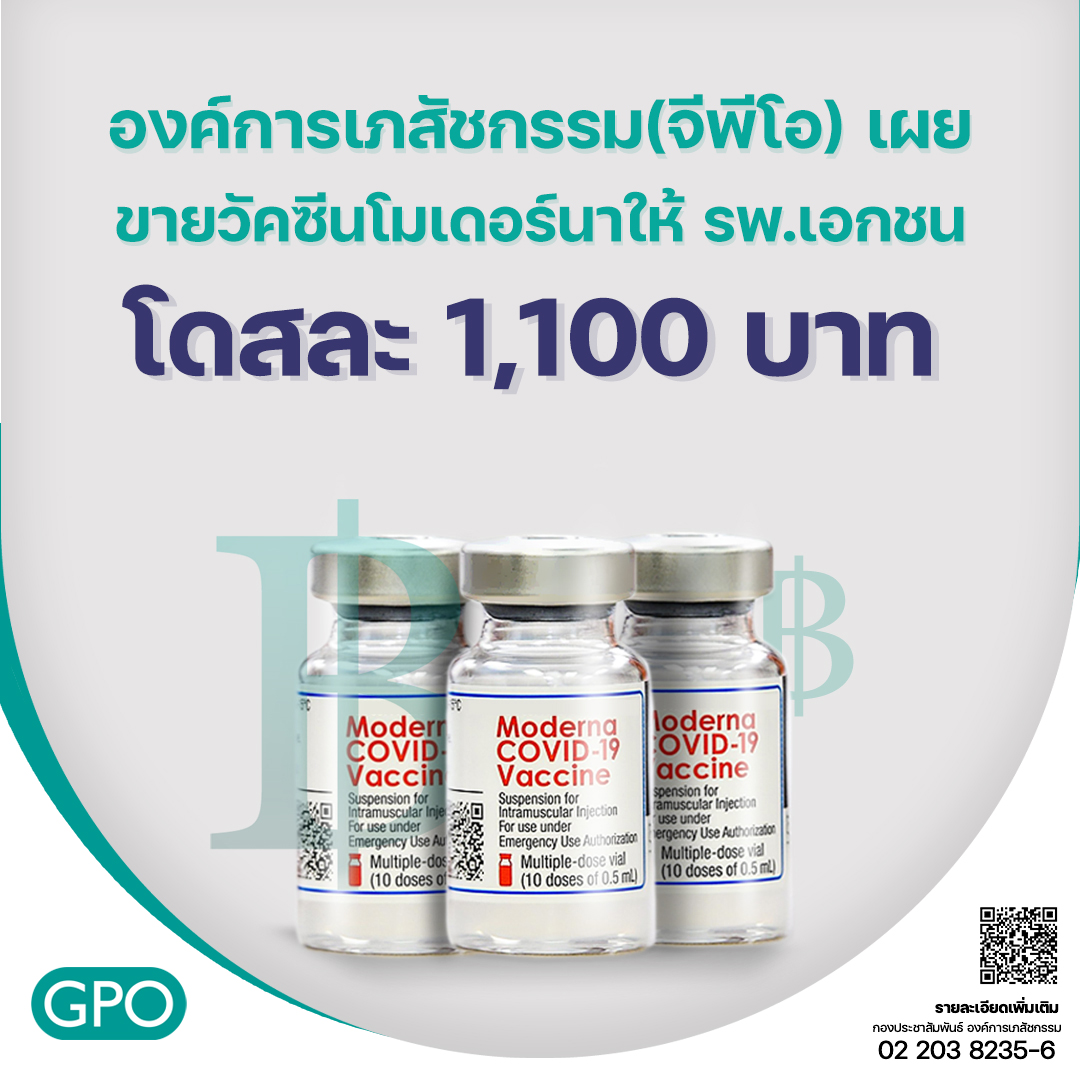 นพ.วิฑูรย์ ด่านวิบูลย์ ผู้อำนวยการองค์การเภสัชกรรม (อภ.) กระทรวงสาธารณสุข ให้สัมภาษณ์ถึงความคืบหน้าการจัดหาวัคซีนโมเดอร์นา ว่า องค์การเภสัชกรรมมีการกำหนดราคาขายวัคซีนโมเดอร์นาให้กับโรงพยาบาลเอกชนแล้ว โดยขายโดสละ 1,100 บาท รวมภาษีมูลค่าเพิ่ม ค่าขนส่ง และค่าประกันภัยรายบุคคล ซึ่งหลังจากนี้สมาคมโรงพยาบาลเอกชนจะไปกำหนดราคากลางค่าบริการฉีดที่เป็นอัตราเดียวกันทุกโรงพยาบาลต่อไป